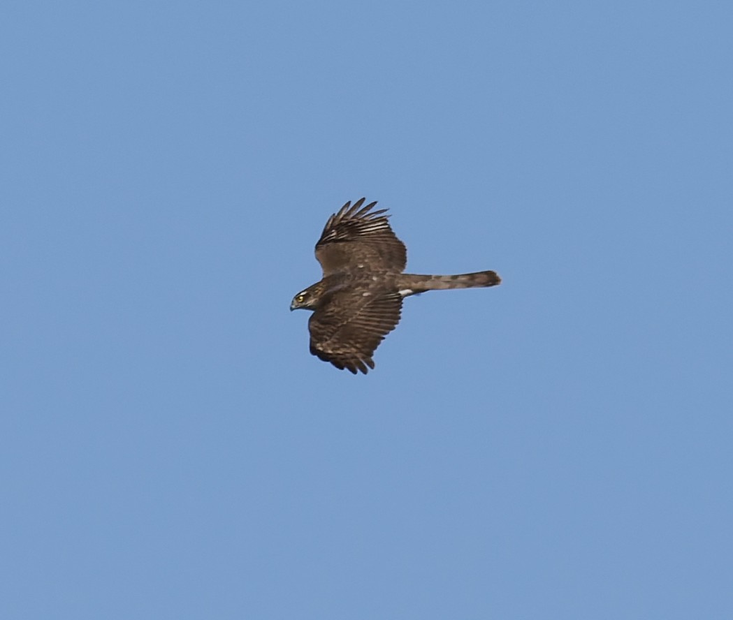 空を見上げていると、遠くでバタバタ羽ばたいてから滑空する野鳥が目に入り、とりあえず撮ってみると、どうもオオタカのようでした。