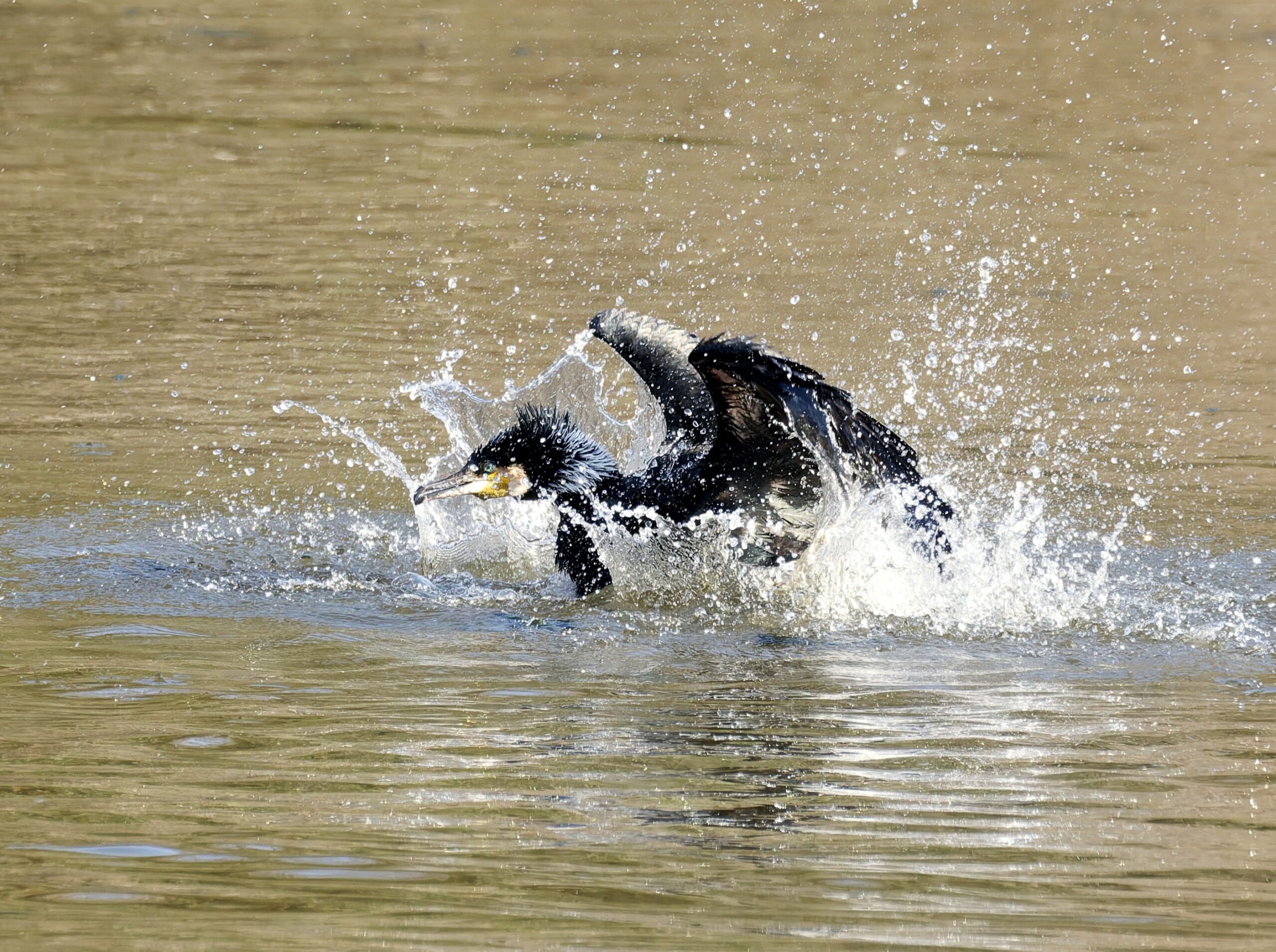 バードサンクチュアリの窓から覗くと、たくさんのカワウが樹木にある巣に入ったり、豪快に水浴びしたり。