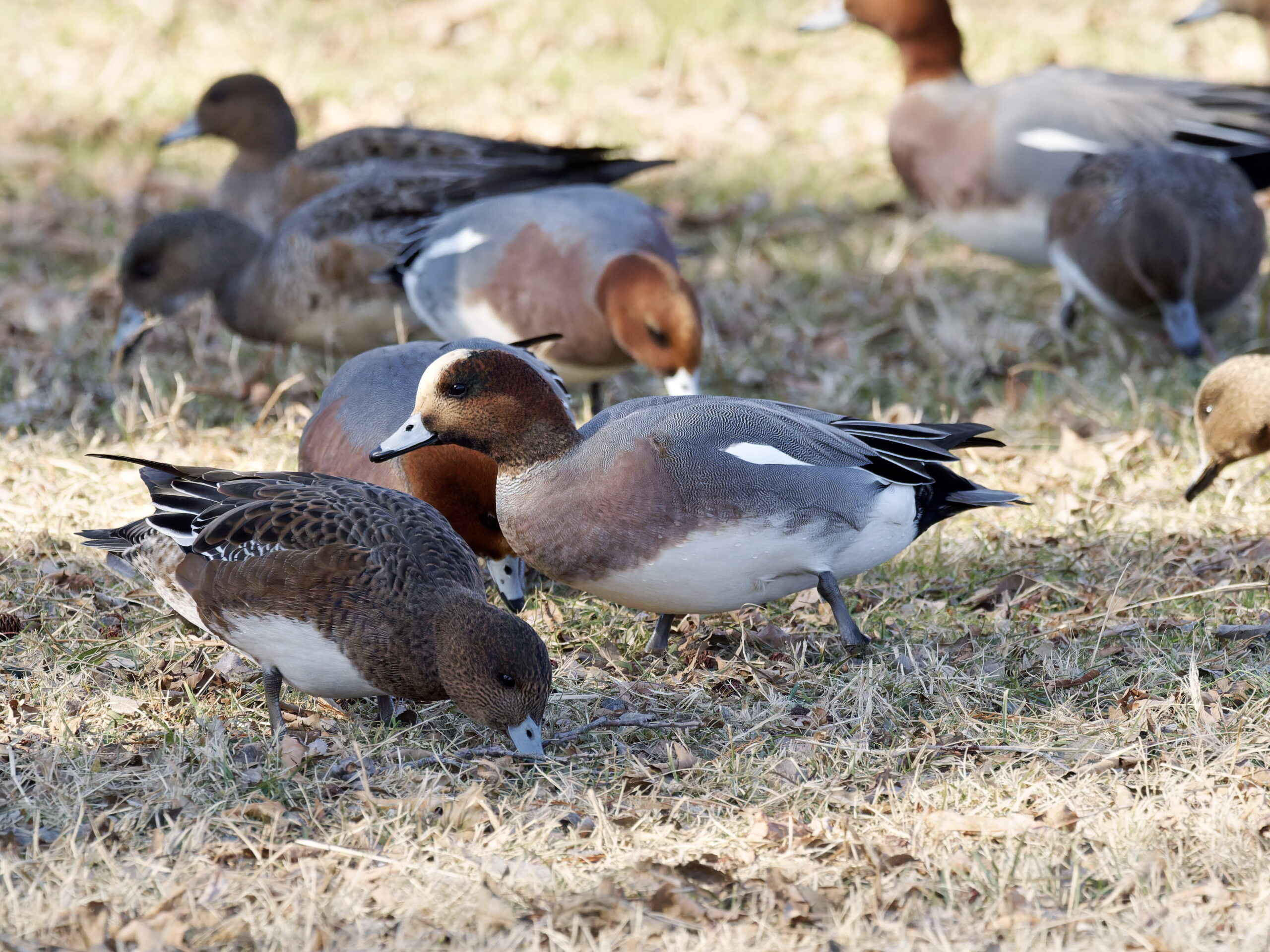 直ぐ近くでは、沢山のヒドリガモが陸に上がって採餌中