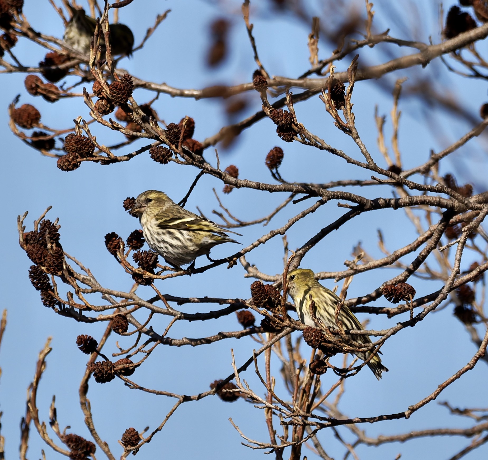 小合溜そばで、ハンノキにマヒワの群れが採餌中。