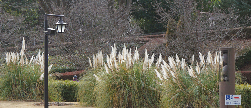 冬枯れ色の景色の中で、パンパスグラスの長い白い穂がきれいでした。