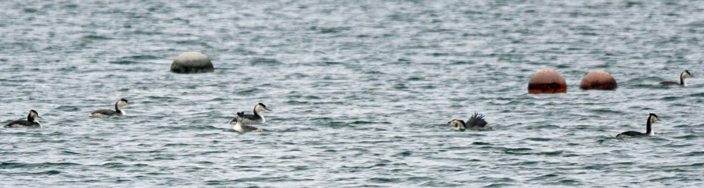 カンムリカイツブリは遥か遠くに10羽ほどがまとまっていました。 すぐに潜るので、なかなかそろって出ていませんが、「あら~、いっぱい居る~!」という感じでした。