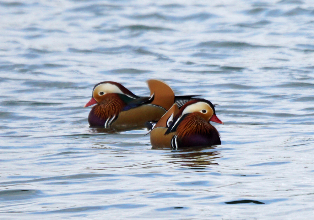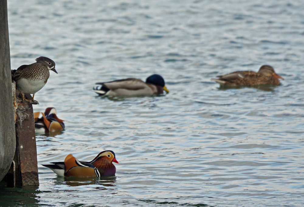 かつてのように、オシドリがずらりと並んで・・・。 とはいきませんが、全部で10羽ほどはいるかな、という感じ。 1度に見えたのは数羽ずつでしたが、比較的近くで見られました。