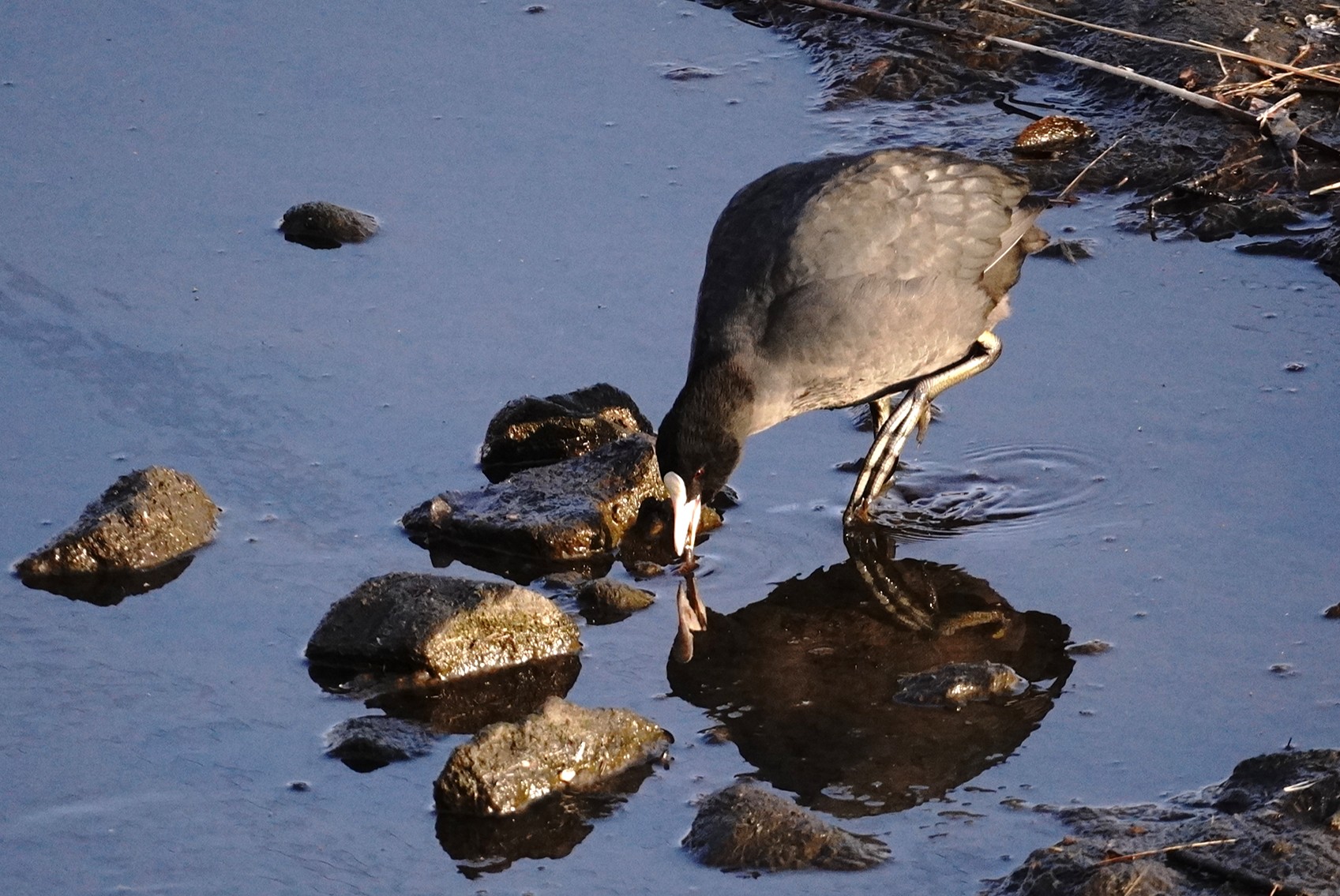 今週のカワセミ、オオバン、ヤマガラや植物ほか 自然通信カワセミ 2026.01.24 今週は1月20日に大寒を迎え、その後は今冬最強の寒波に見舞われています。 晴れても北風の冷たさを感じますが、梅は満開に近くなり春の足音も忍び寄って、鳥たちは元気溌剌!普通に誰もが目にする川や公園、その周辺の様子です。 カワセミ オオバン 雑食で植物のほか水辺の昆虫や、貝、甲殻類を食べます ヨコズナサシガメ幼虫は相変わらず集団越冬 民家で満開になっているのは梅の花でしょうか 違う種類の蠟梅の花 よい香りがします コガモの群れ あの交雑種のカモは、2羽のカルガモと一緒に行動していました アオジはいつでも目にします ふわふわした穂が落ちて、きりっとしたオギが北風に揺れていました ユリカモメ採餌中 モズはあちこちに メジロ ヤマガラ 枯れ葉の中を採餌中 シロハラも採餌中 ツチイナゴ よく見たらモズにはやにえにされていました 後ろに回ると、枝に突き刺されていました 成虫越冬のツチイナゴですが、鳥たちの大事な食糧になっています
