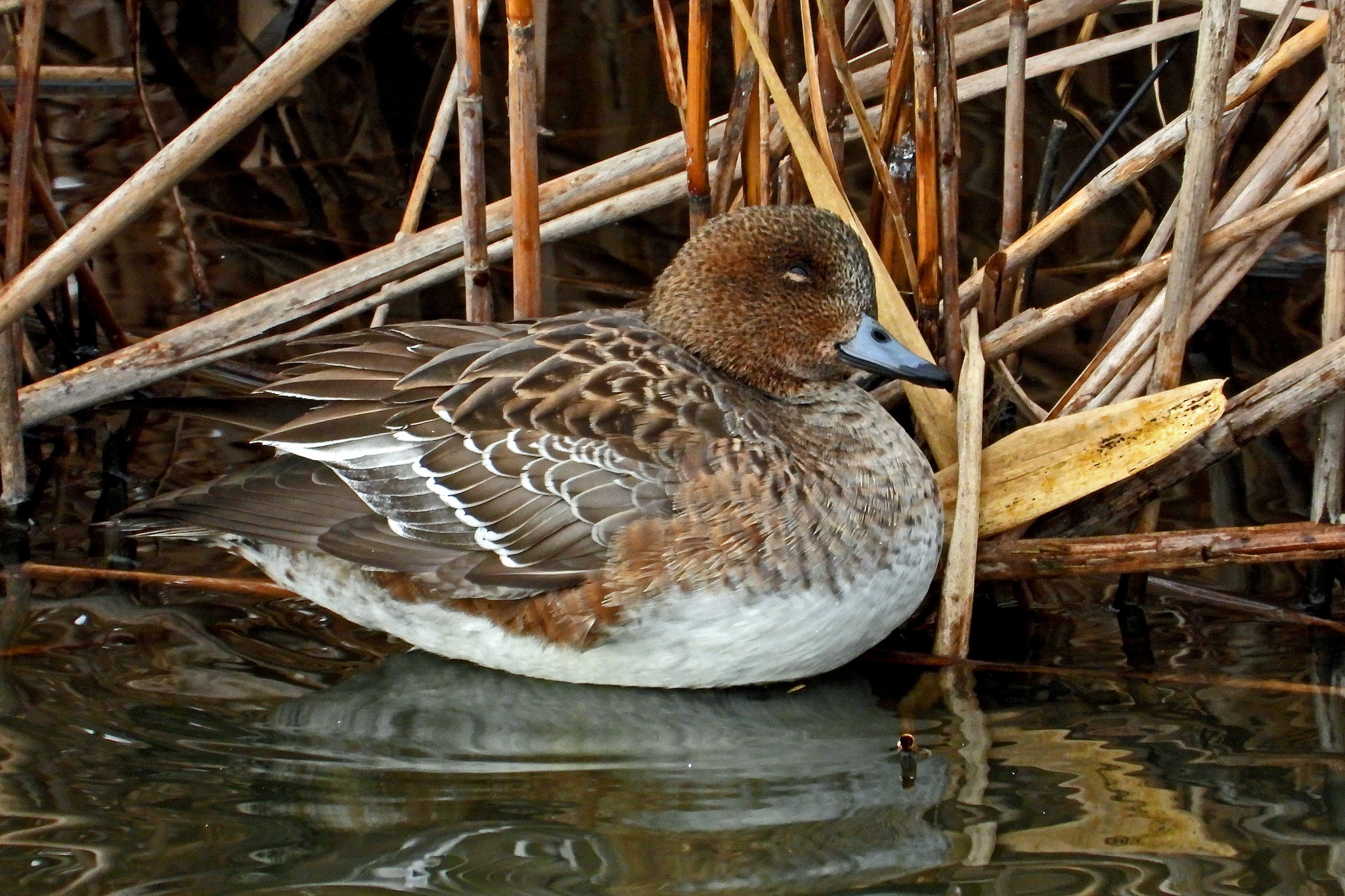 換羽中のオスの「ハシビロガモ」がうずくまってます。