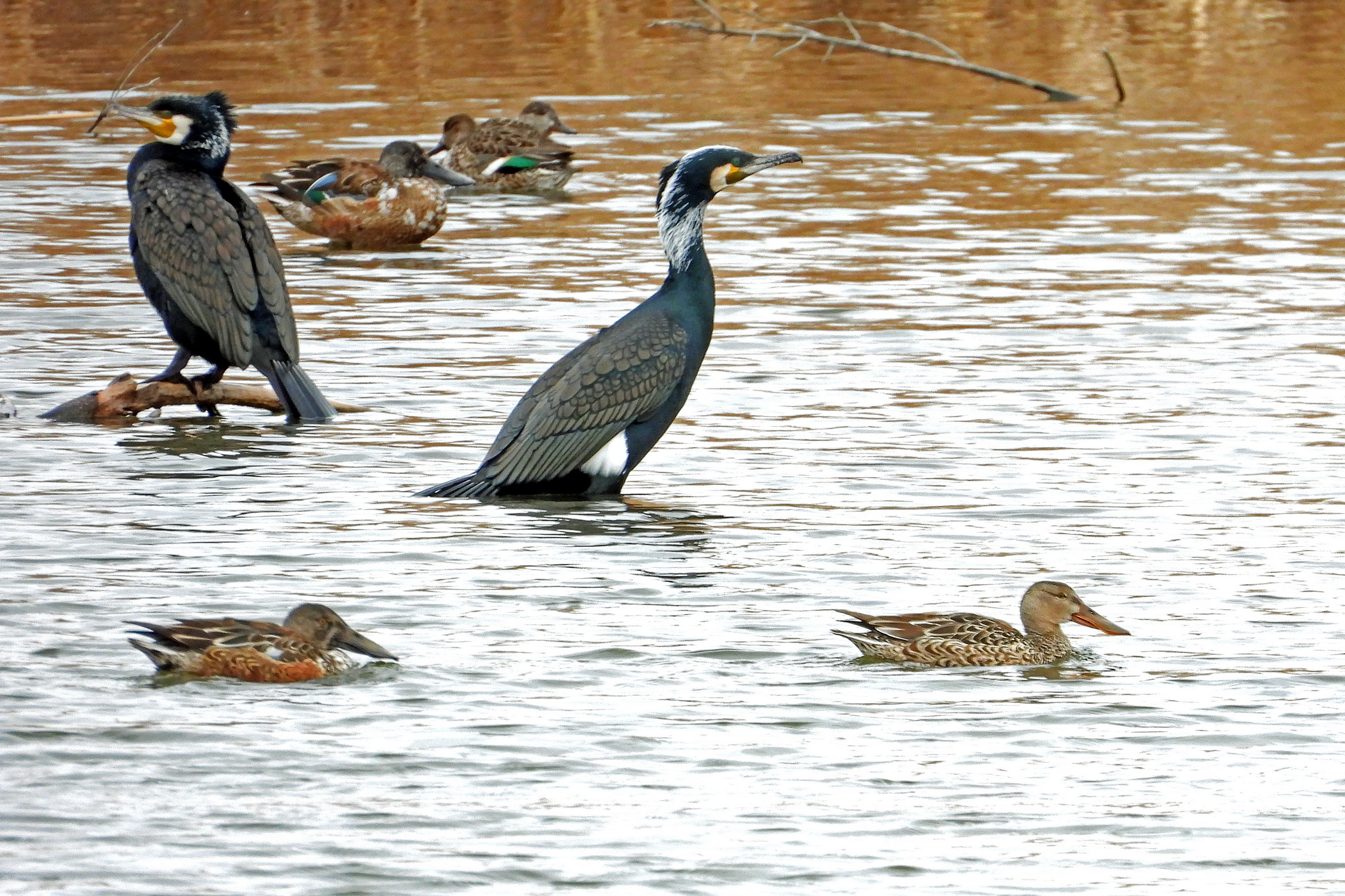 その向こうに「カワウ」に「ハシビロガモ」に「コガモ」が写ってました。