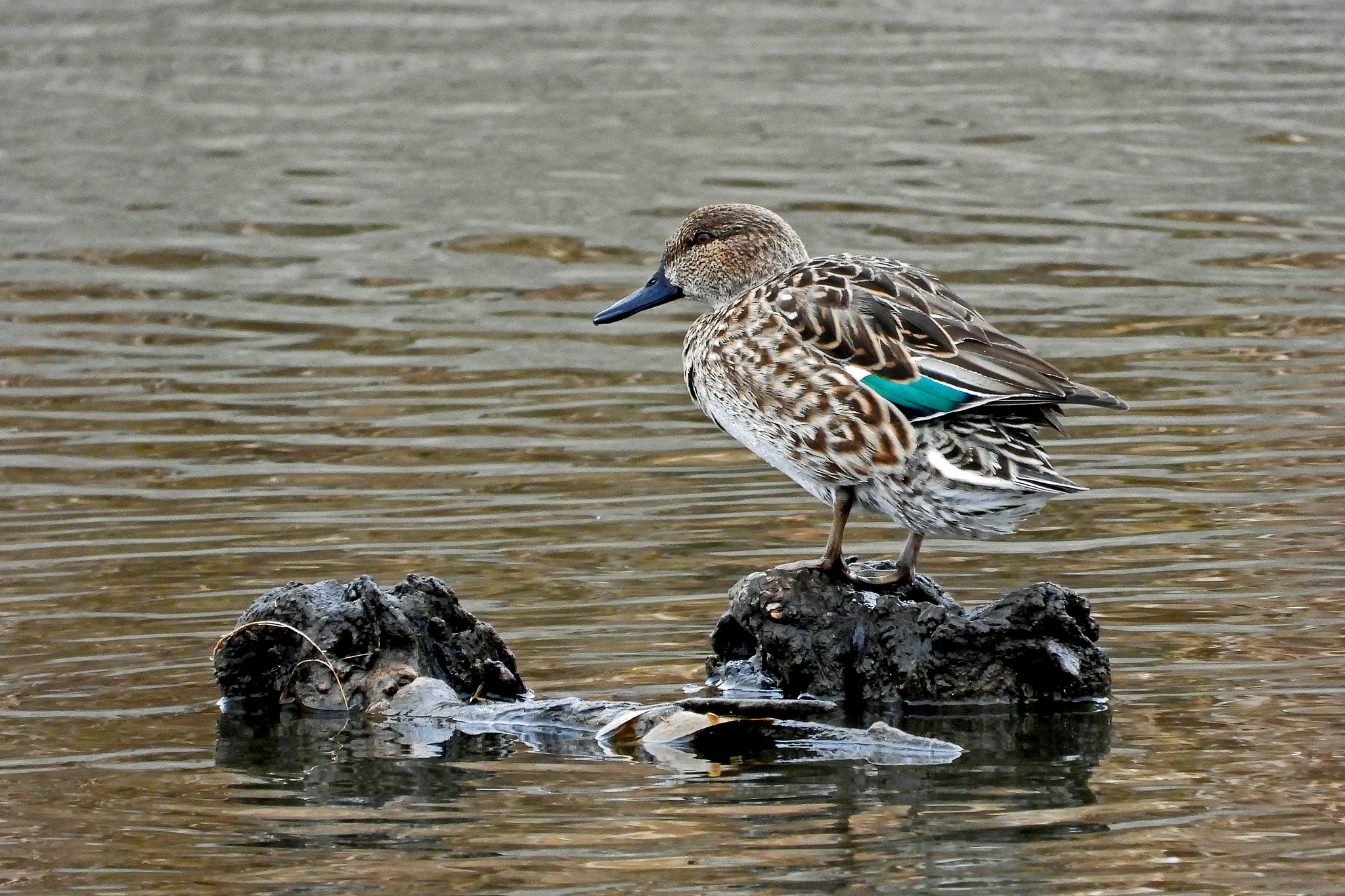 「コガモ」のメスが石の上で佇んでました。