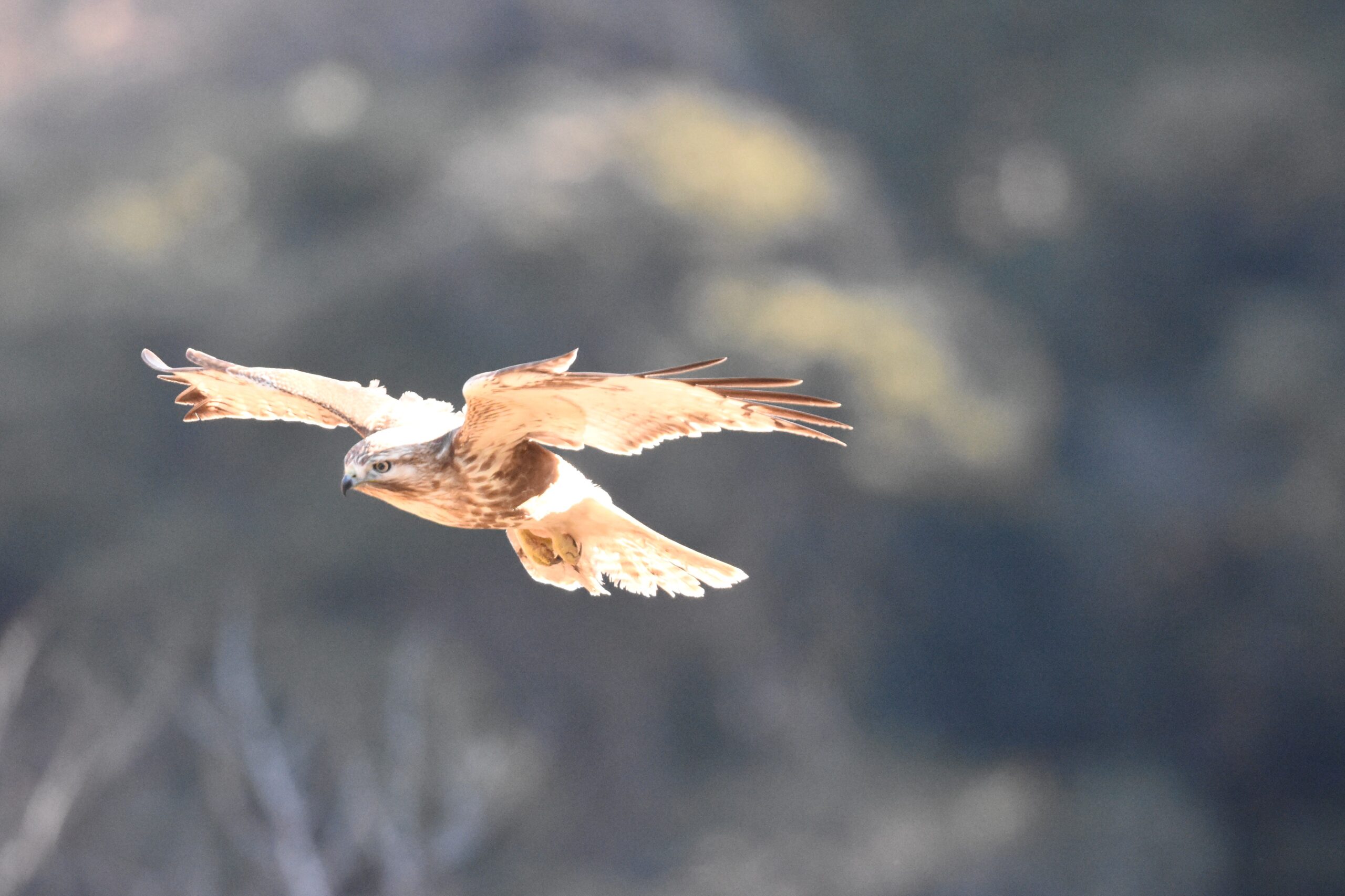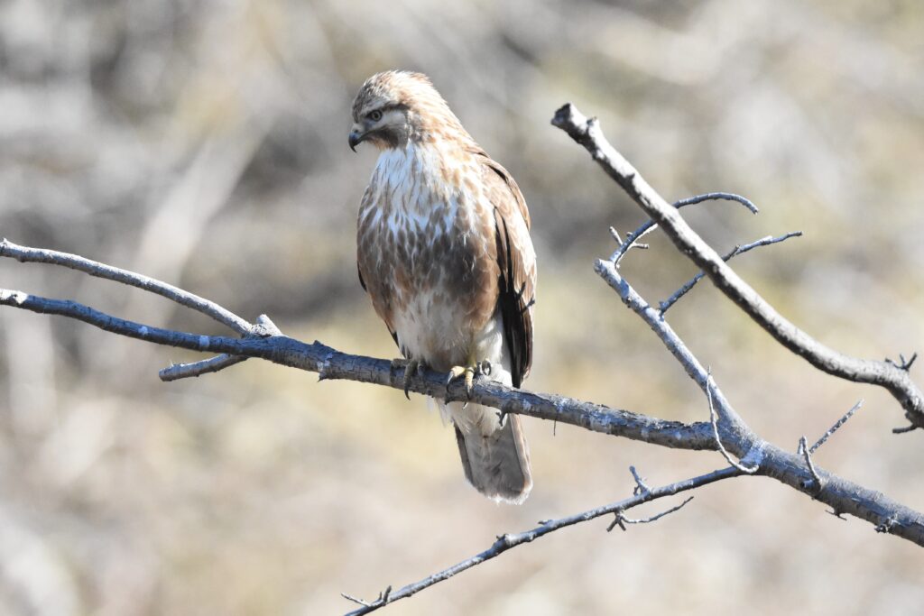 ノスリは今年も2羽いるようです。最近は人慣れしたのか、餌がないのか、この写真はあまりにも近くに止まったので後ずさりをして撮りました。山の上の高い木から私のサバに下りてきました。