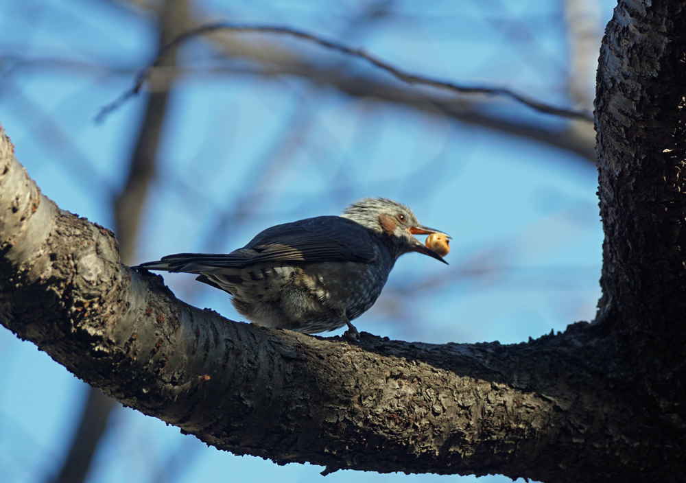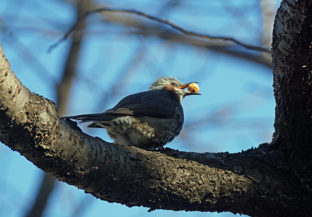 ヒヨドリがセンダンの実をくわえて、嬉しそう。