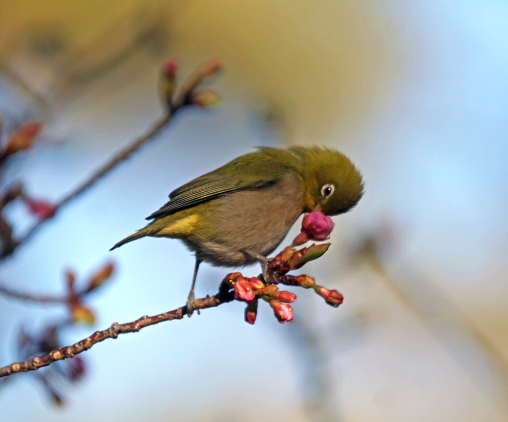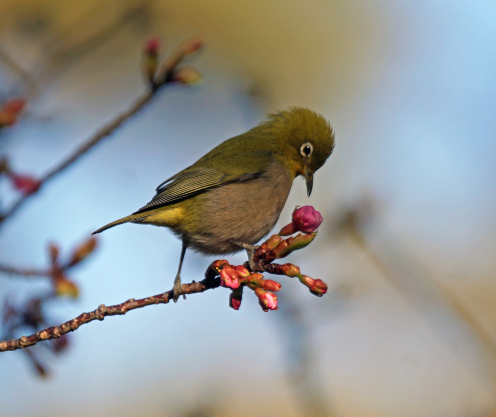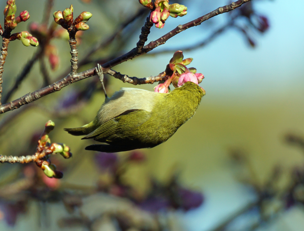 近くの神社でも、カワズザクラが少しずつ咲き進んで、メジロたちが来ていました。