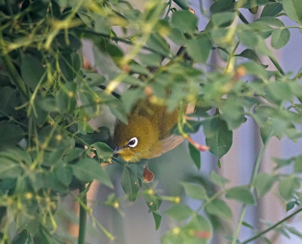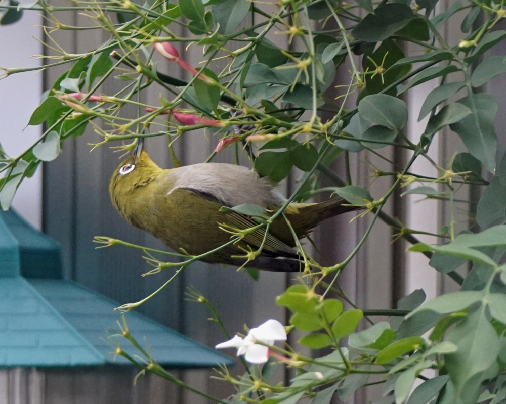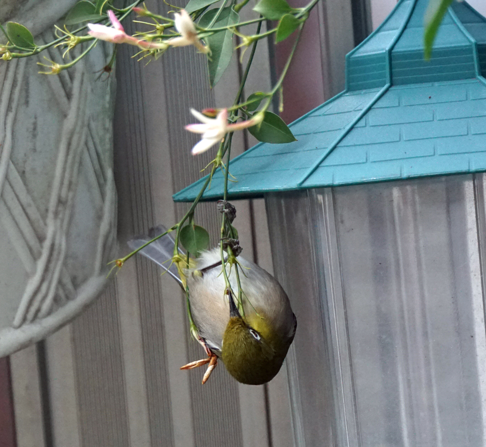 メジロは、家では、まだ少し花の残ったジャスミンの枝にチョコチョコやって来ます。