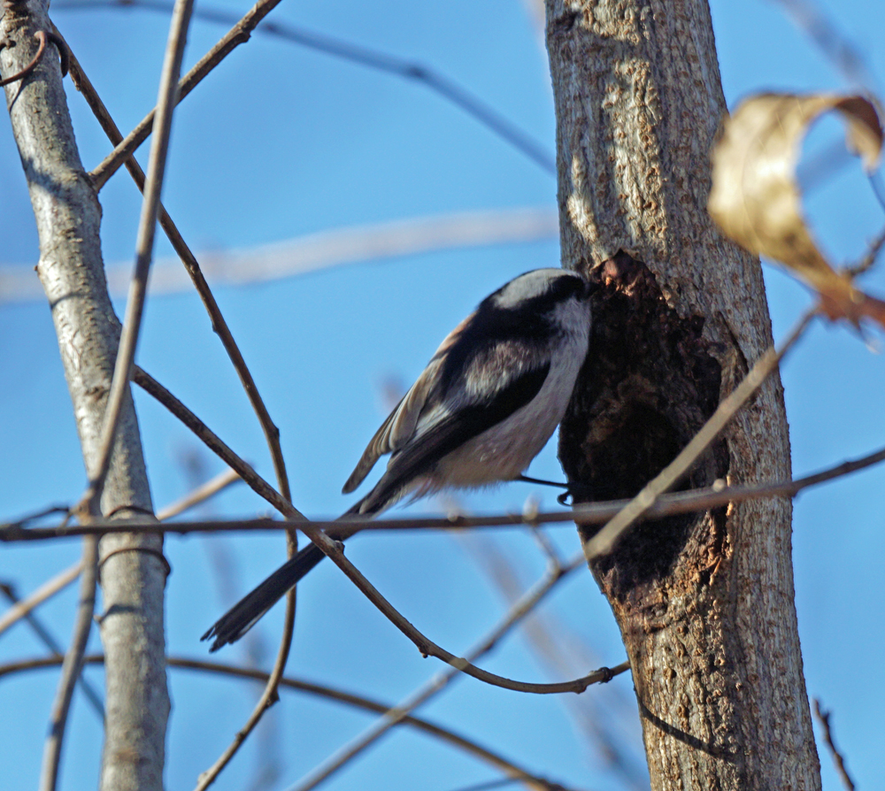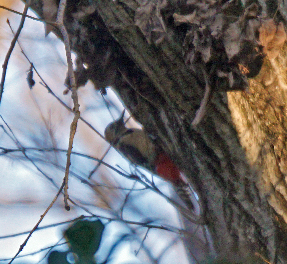 幹に止まって、何やら食べている? こすり採っている? 巣材採り、というわけでもなさそうです。小さな虫でも居るのかな。