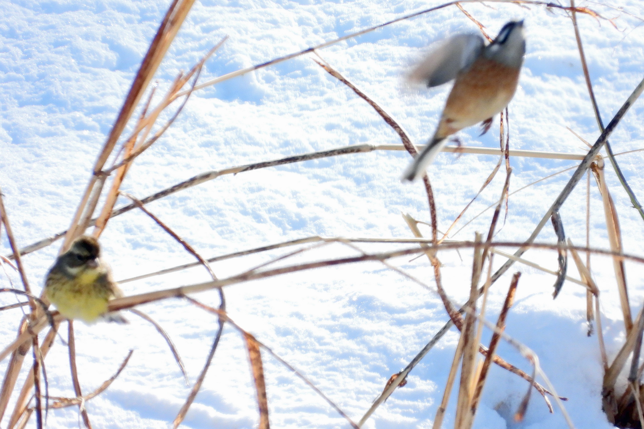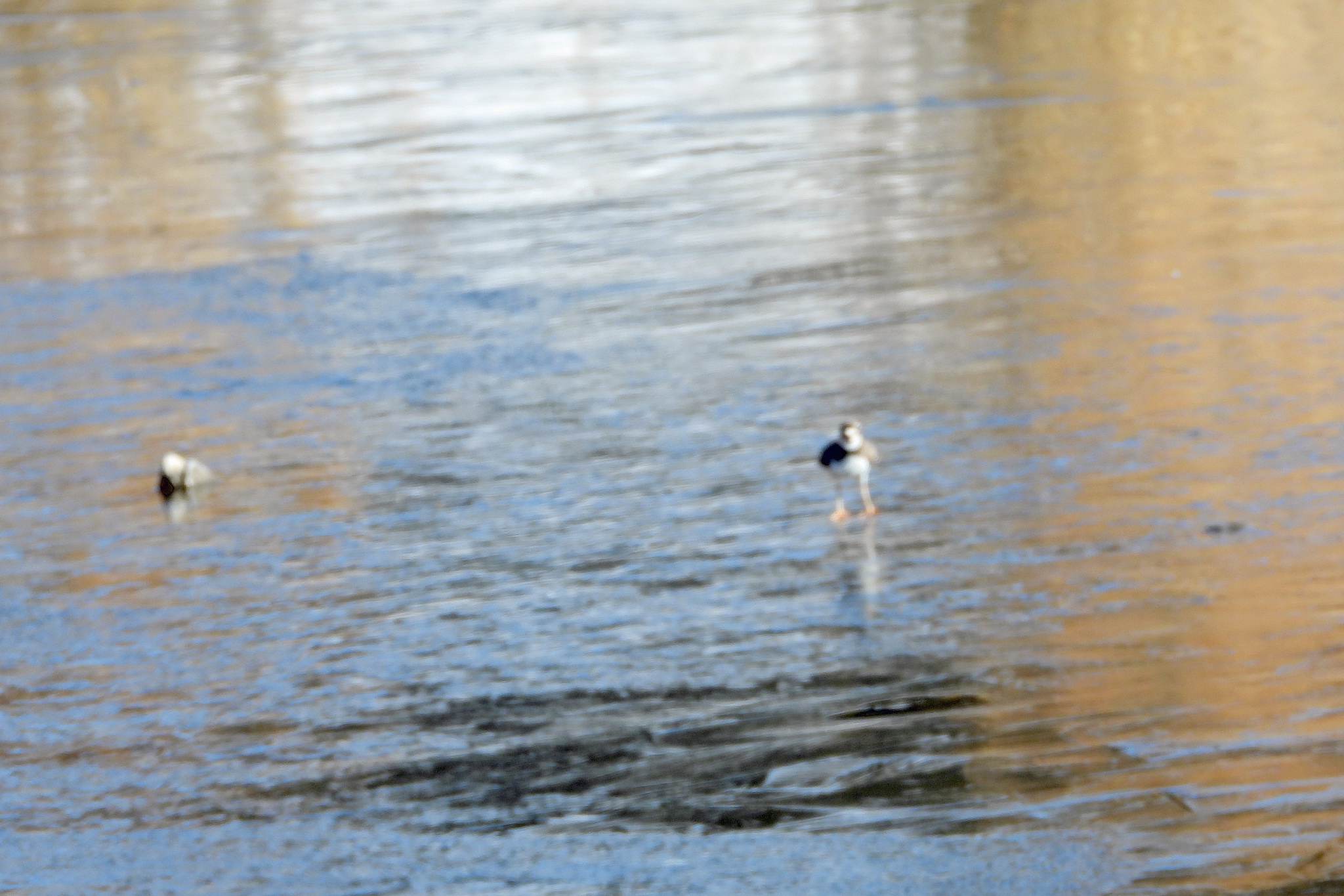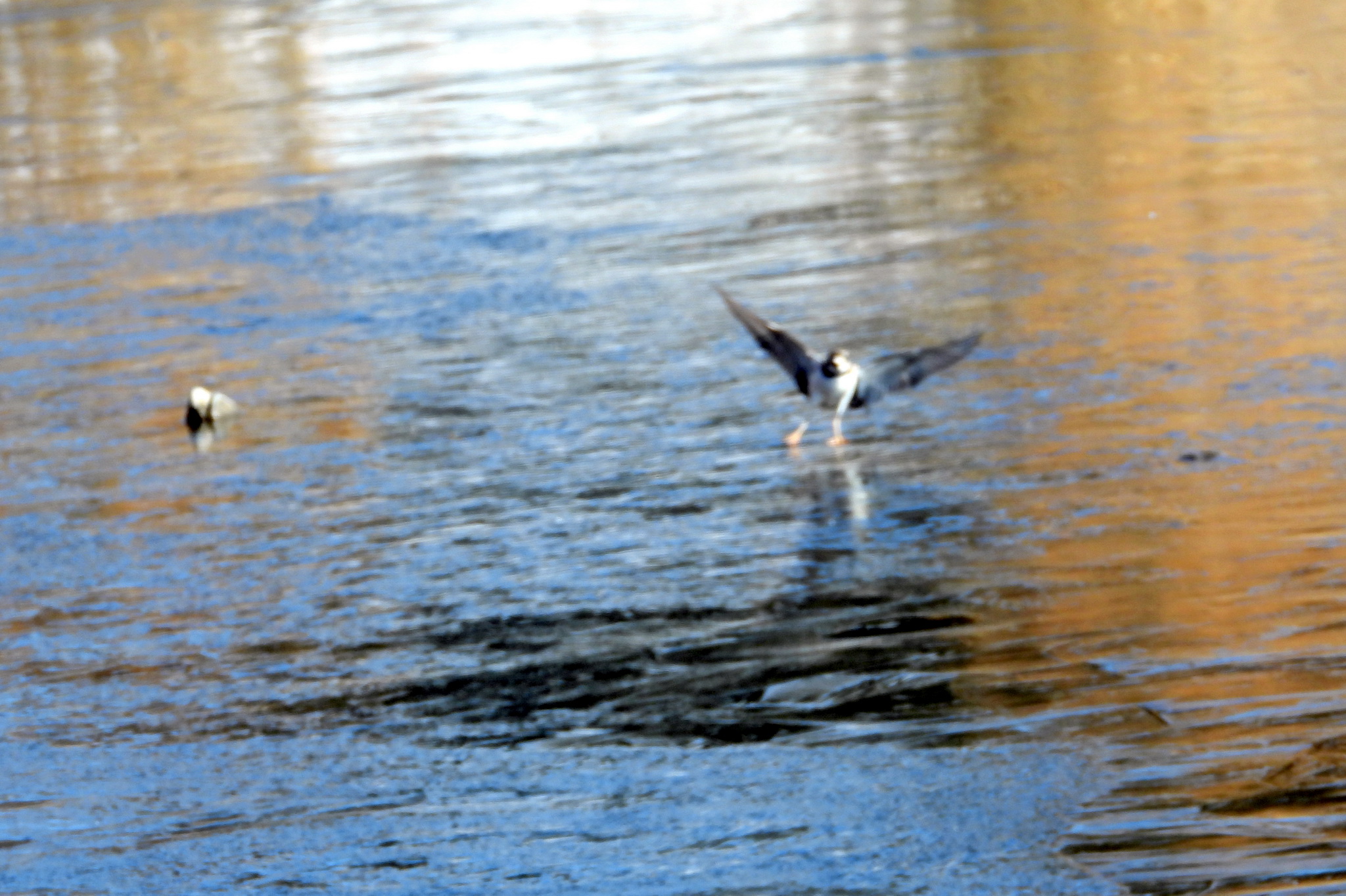 あっ、シギチ系の鳥が飛んで来て、凍った遊水地に着氷しました。