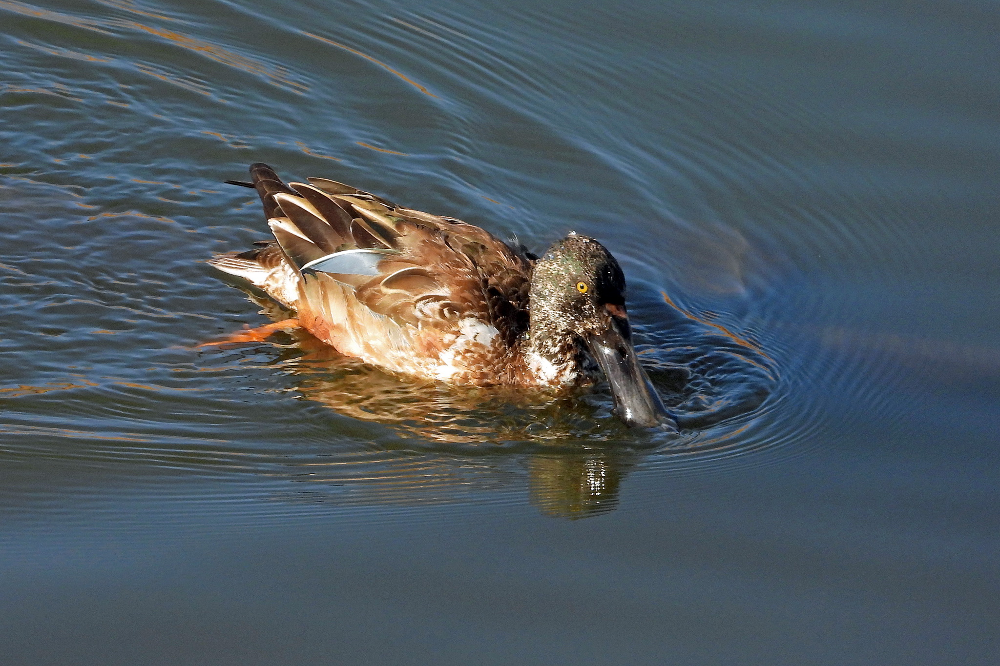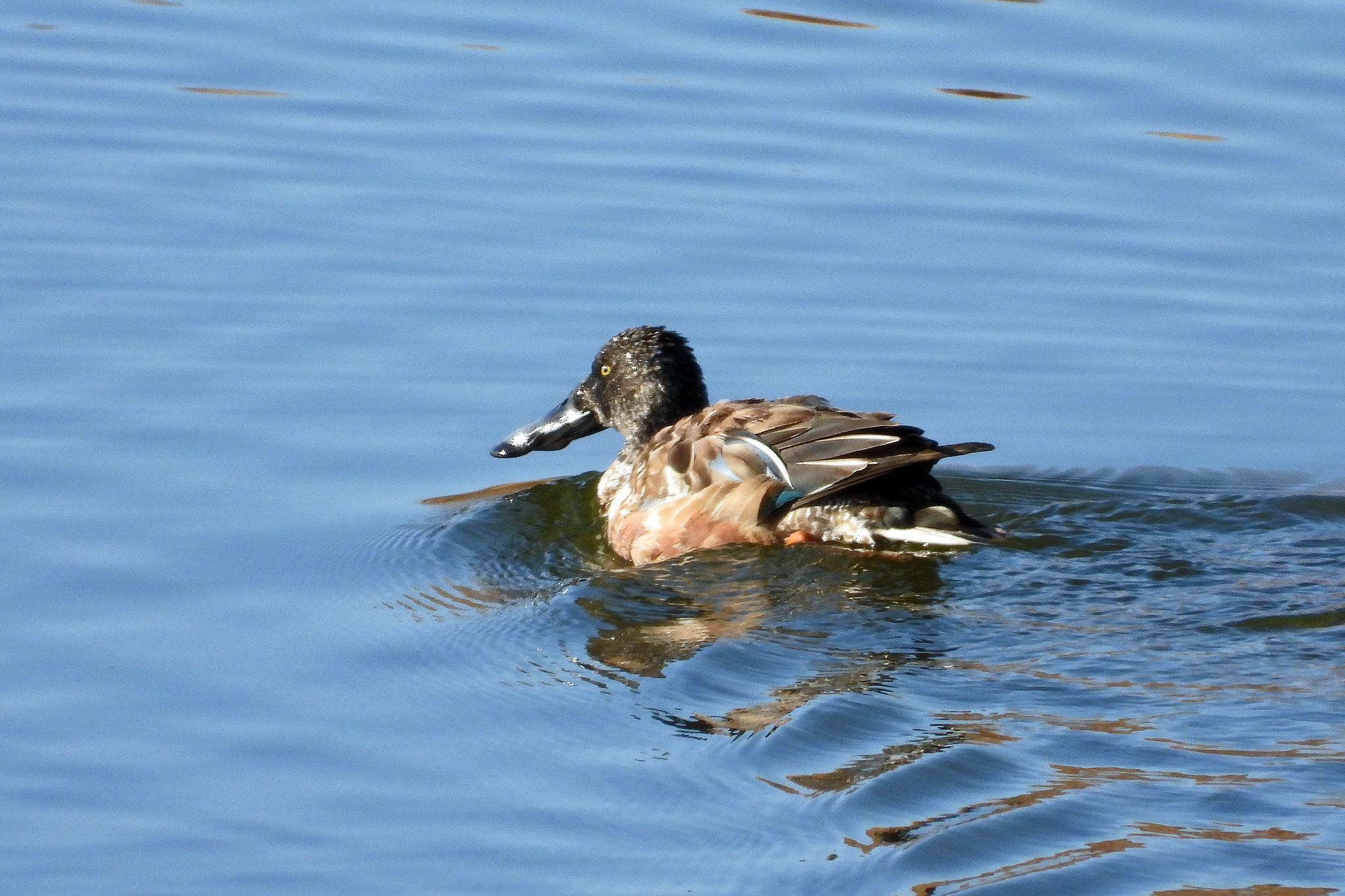 おっ、換羽中のオスの「ハシビロガモ」が出てきました。