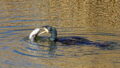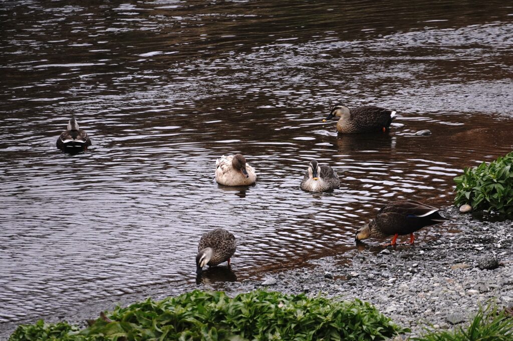 交雑種のカモとカルガモの群れ