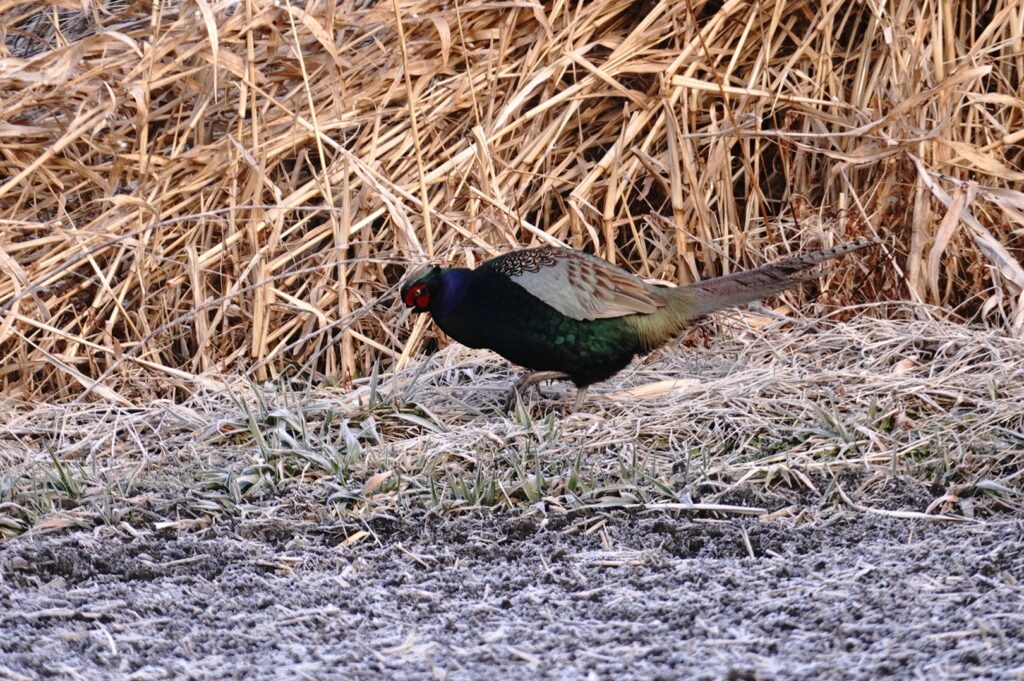 キジ 冷え込んだ朝のあぜ道で採餌