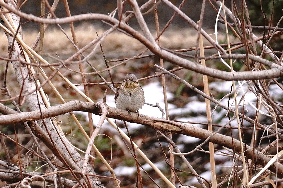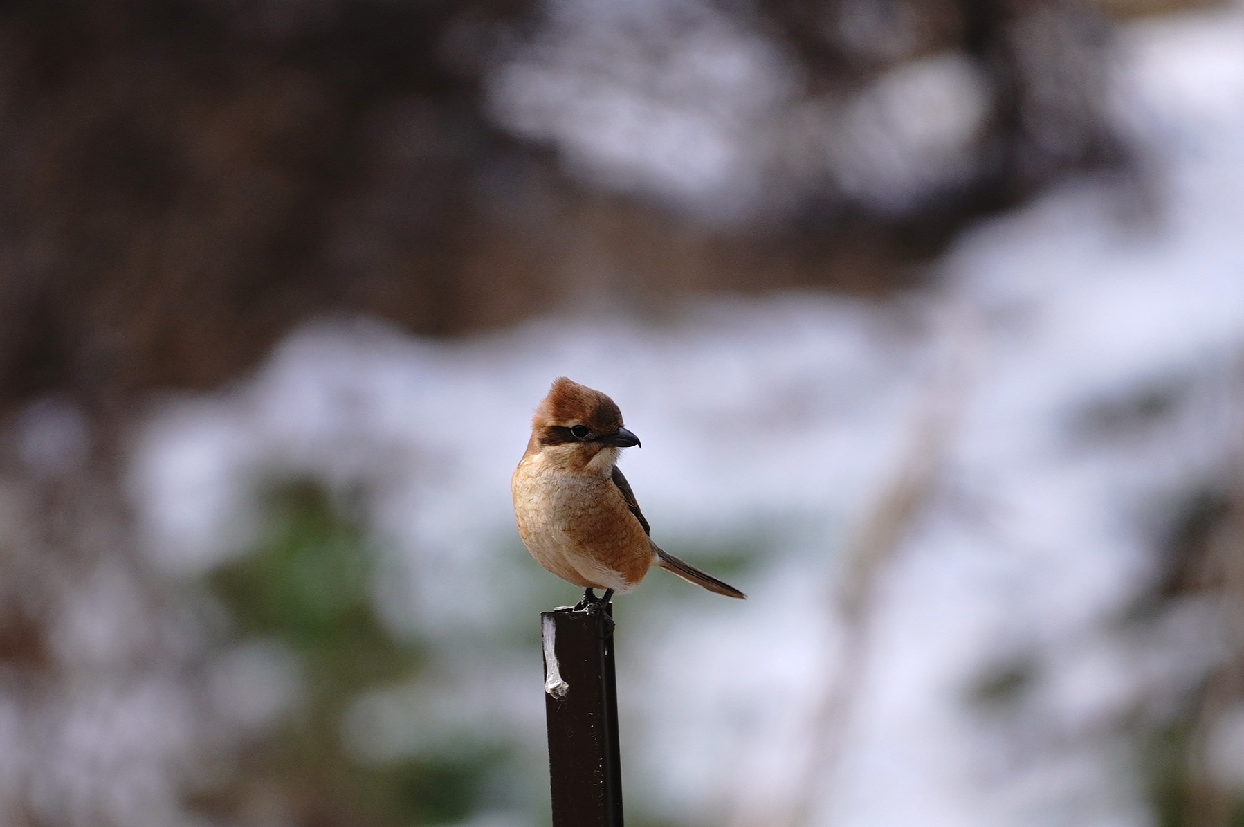 モズ♀ 強い風で頭が逆立っていました バックに残雪