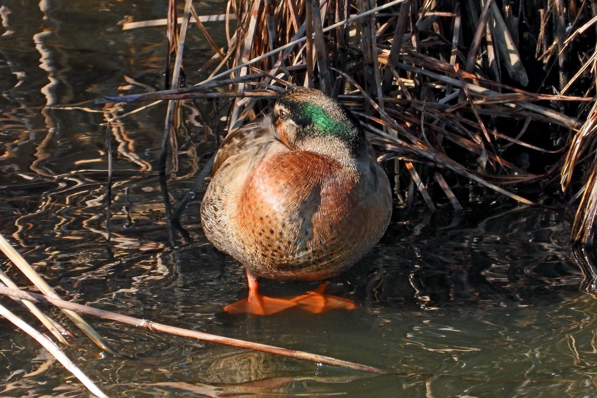「ヨシガモ」のオスがうずくまってます。