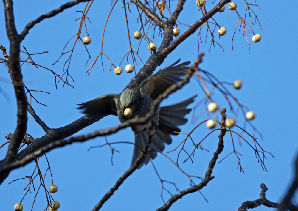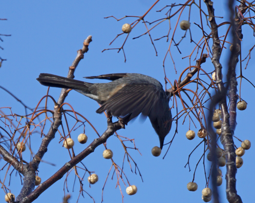 センダンの枝で、ヒヨドリが実を啄んでいました。