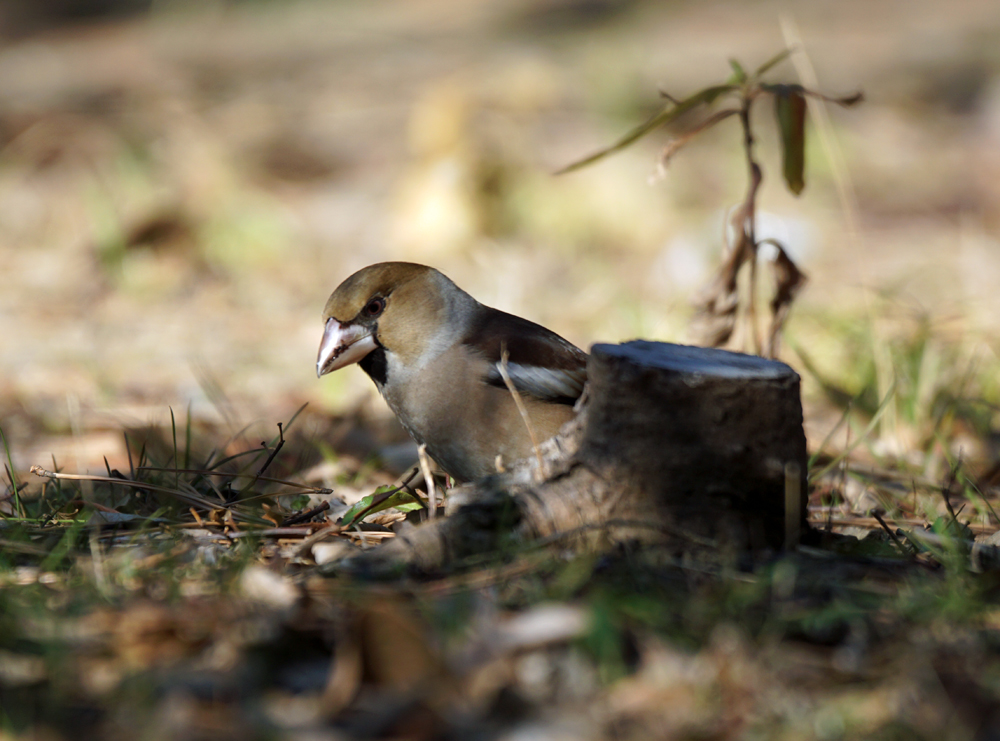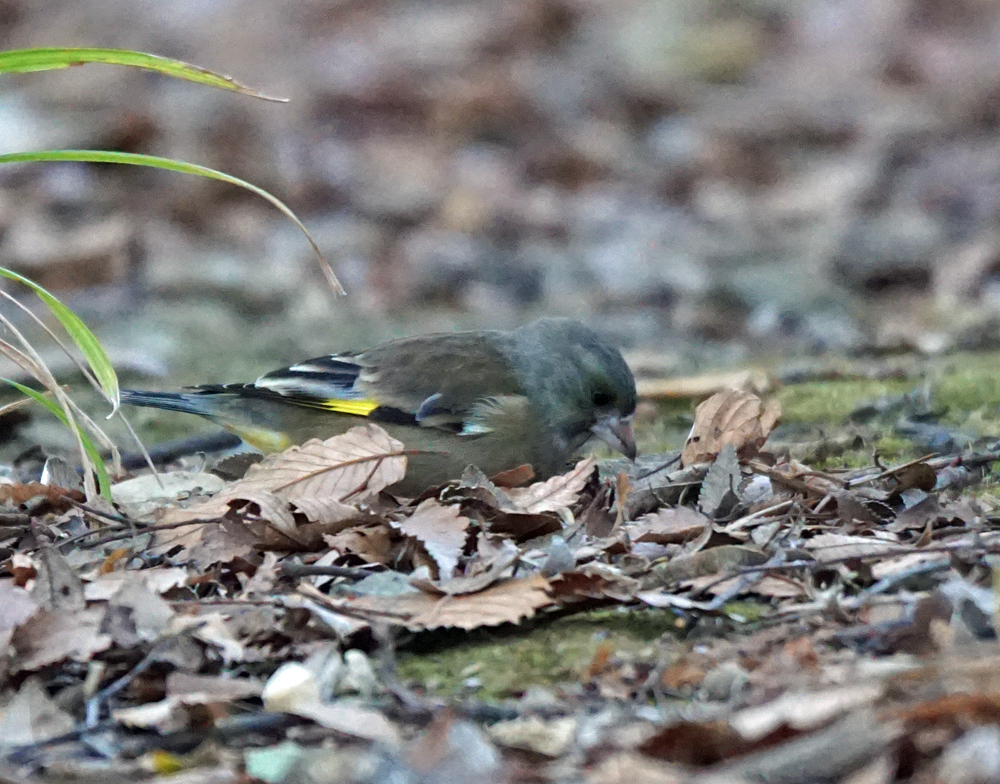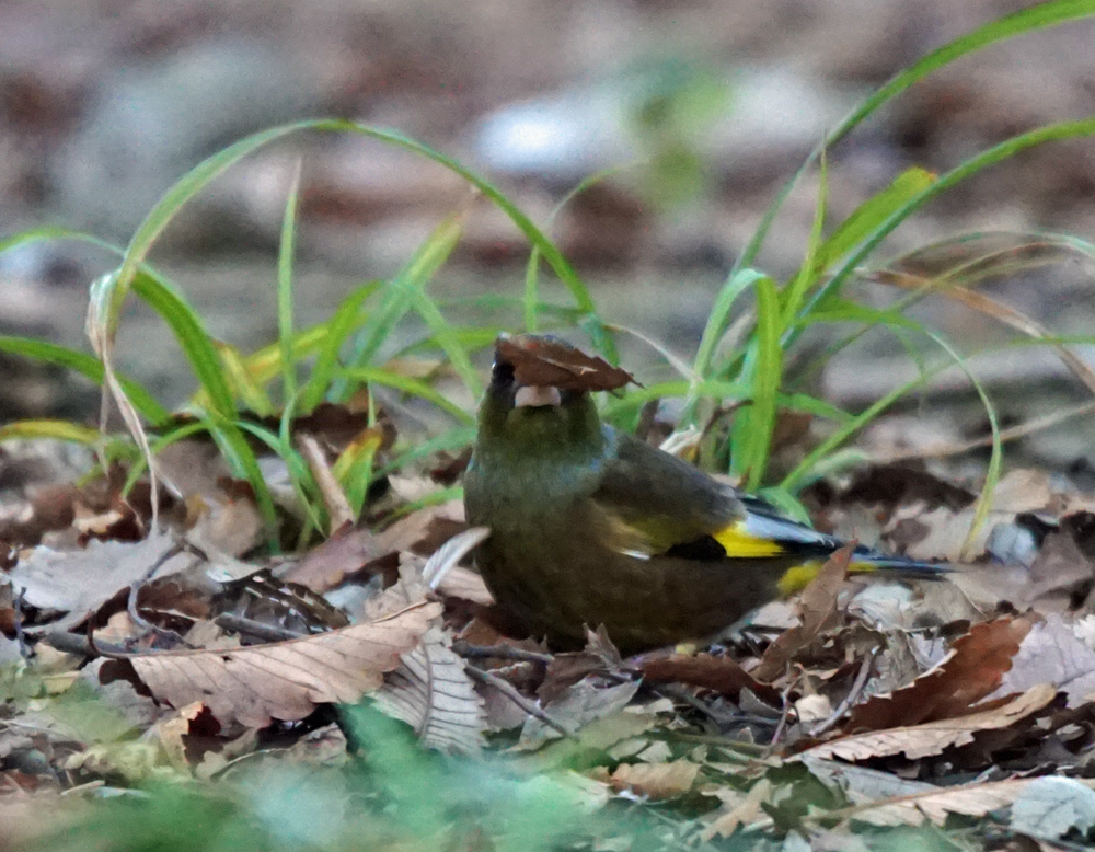 カワラヒワも地面で落ち葉を返しながら餌探し。