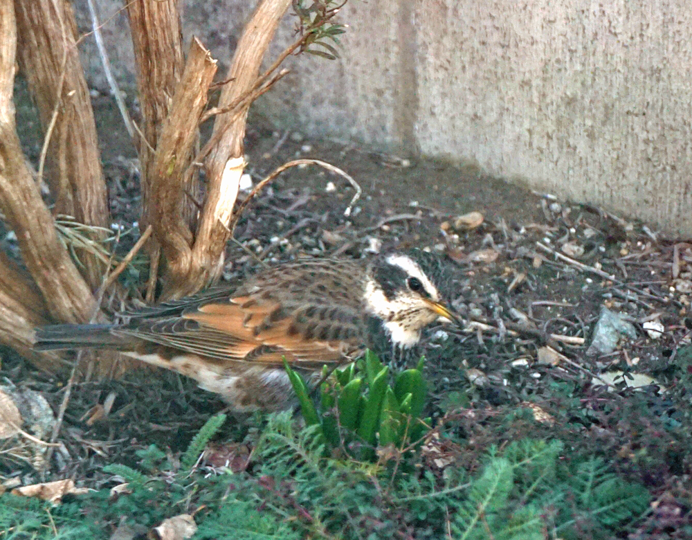 庭の隅っこで落ち葉を返したりしながら、何やらしきりに食べていました。