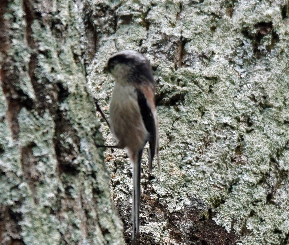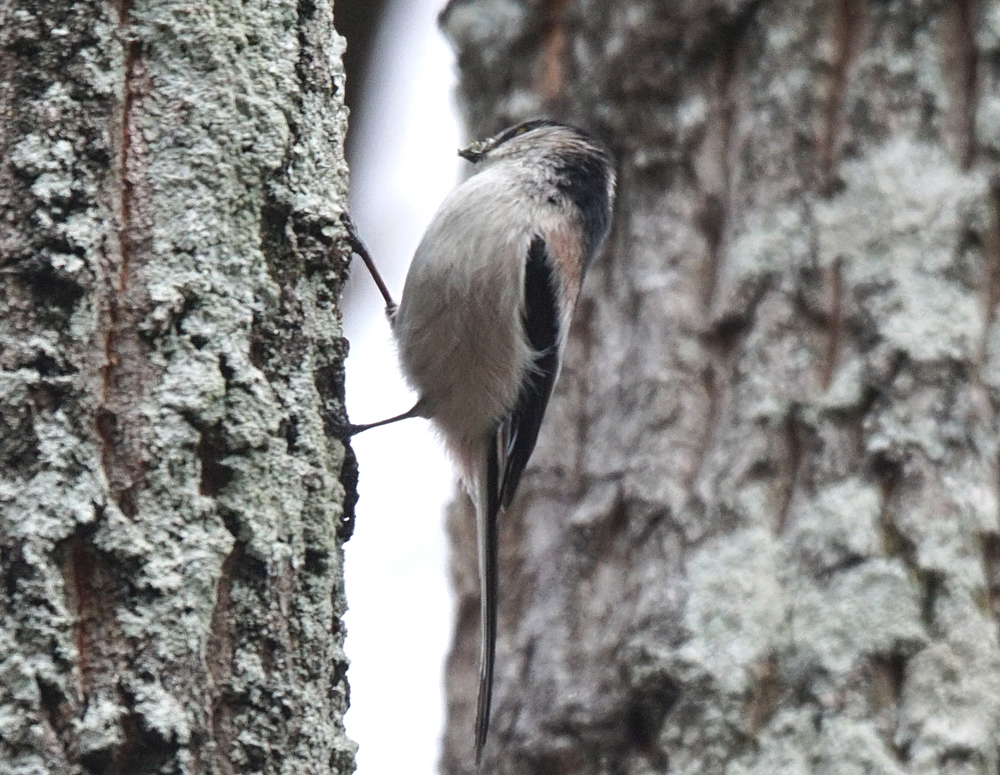 ここでもエナガの巣材集めの動きが見られました。 クヌギの幹に付いた白っぽい苔のような物(ウメノキゴケ?)を2羽で採っていました。