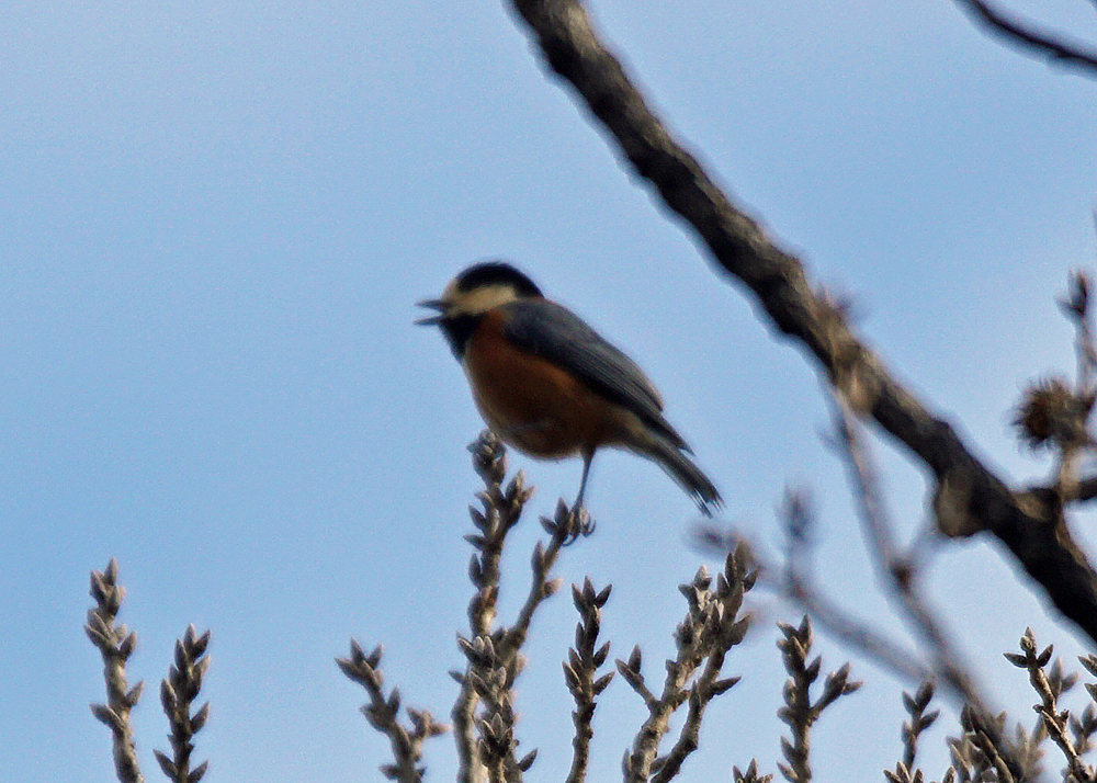 ツツピーー、ツツピーー、とのんびりしたヤマガラの囀りが聞こえてきました。 この春初めてききました。長閑な感じです。 クヌギの枝の高~い所いました。