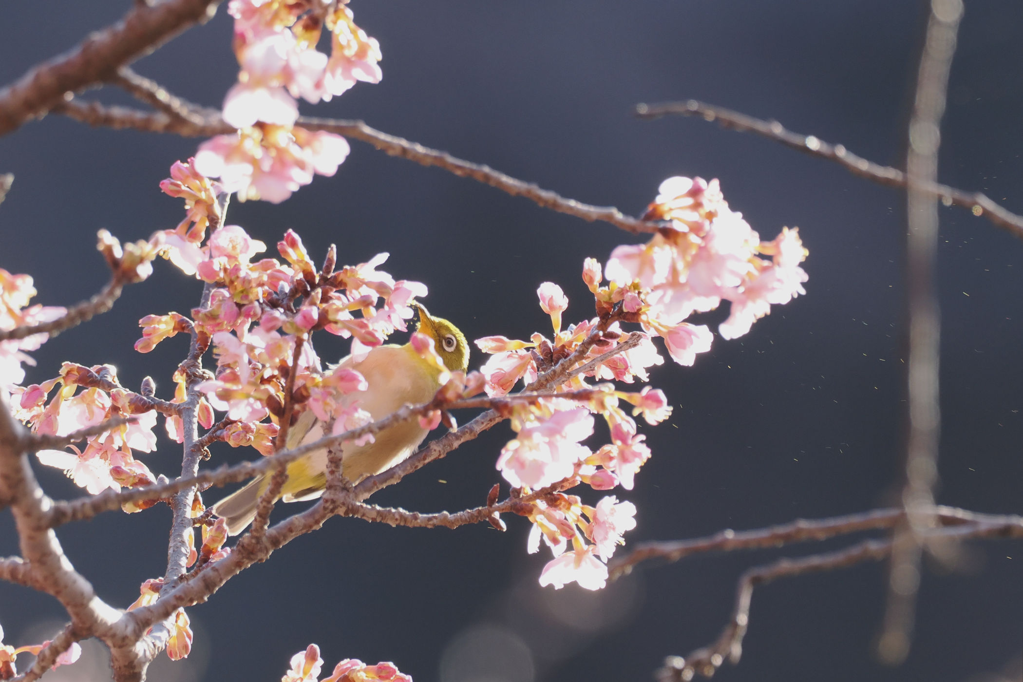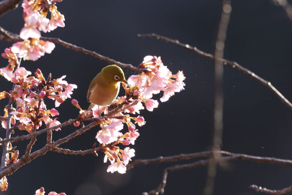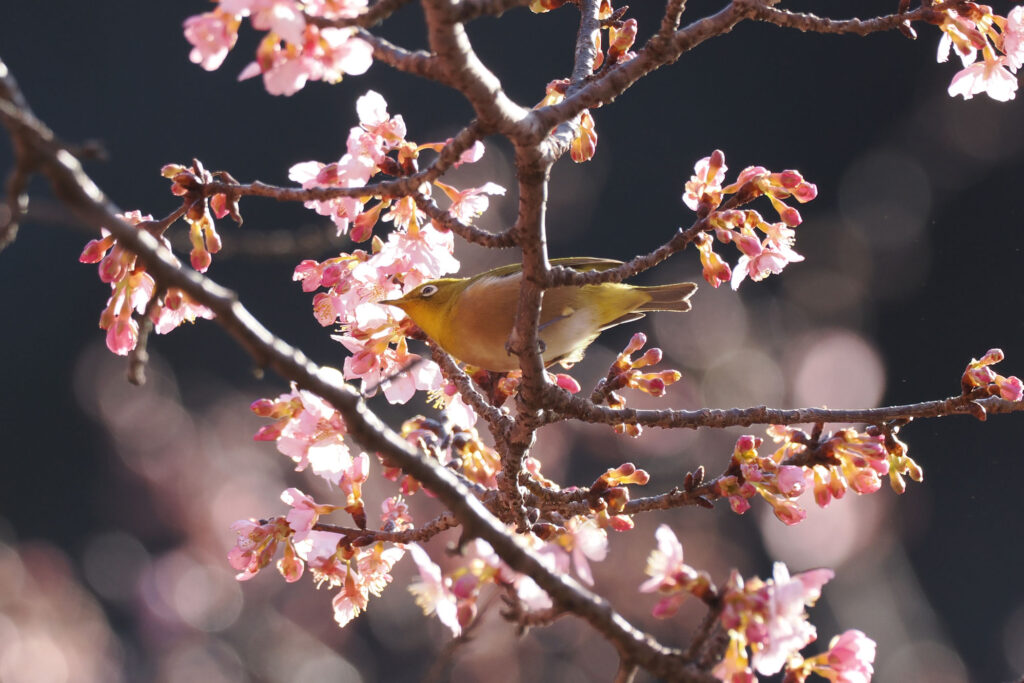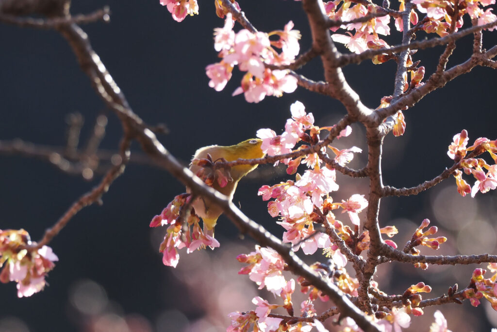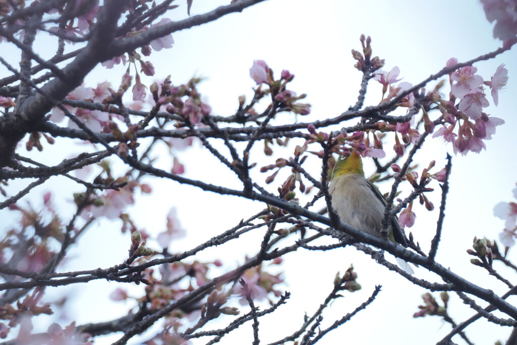 再び日が当たり始めた河津桜にメジロさん