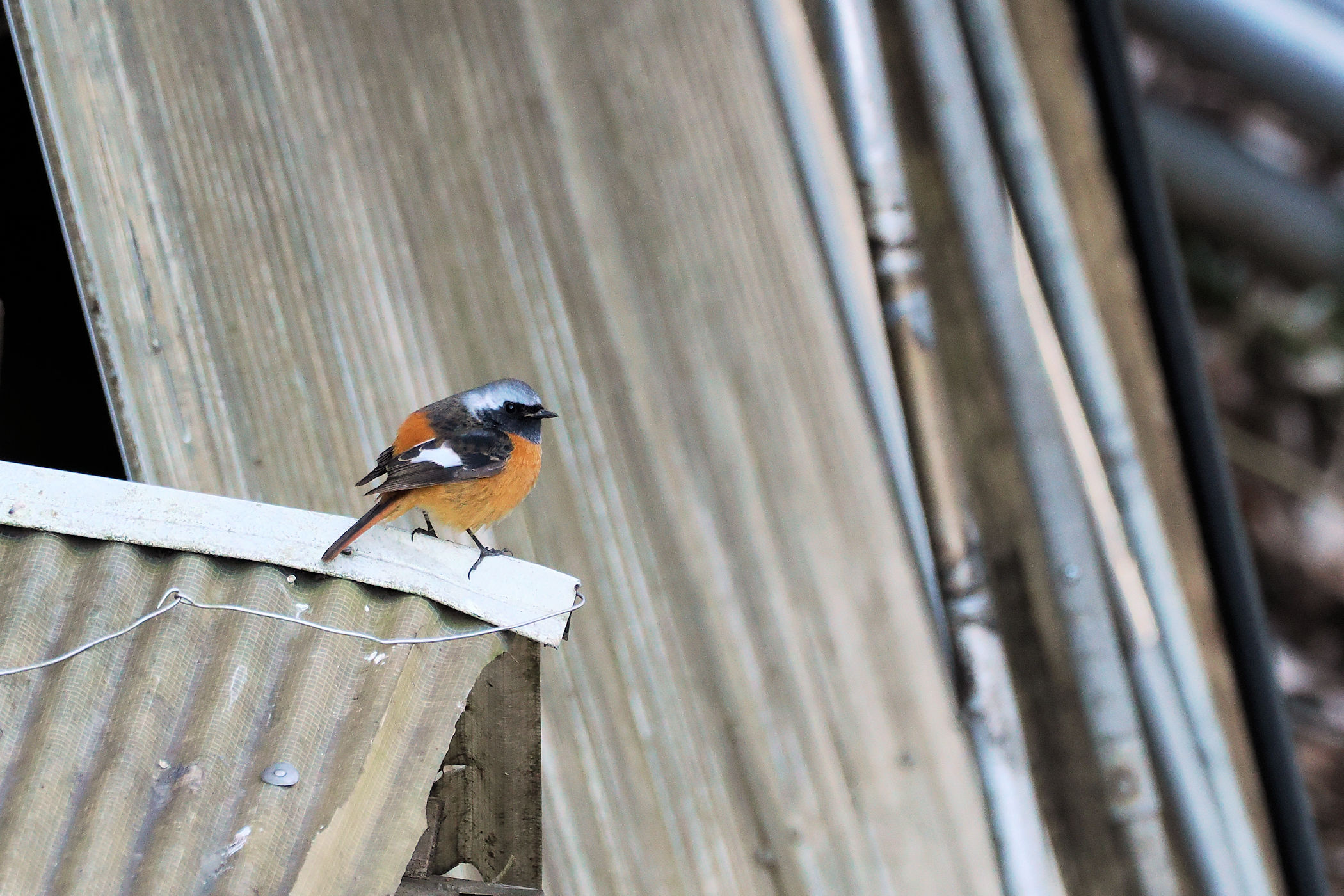 ジョウビタキの坊ちゃんがトタン屋根に