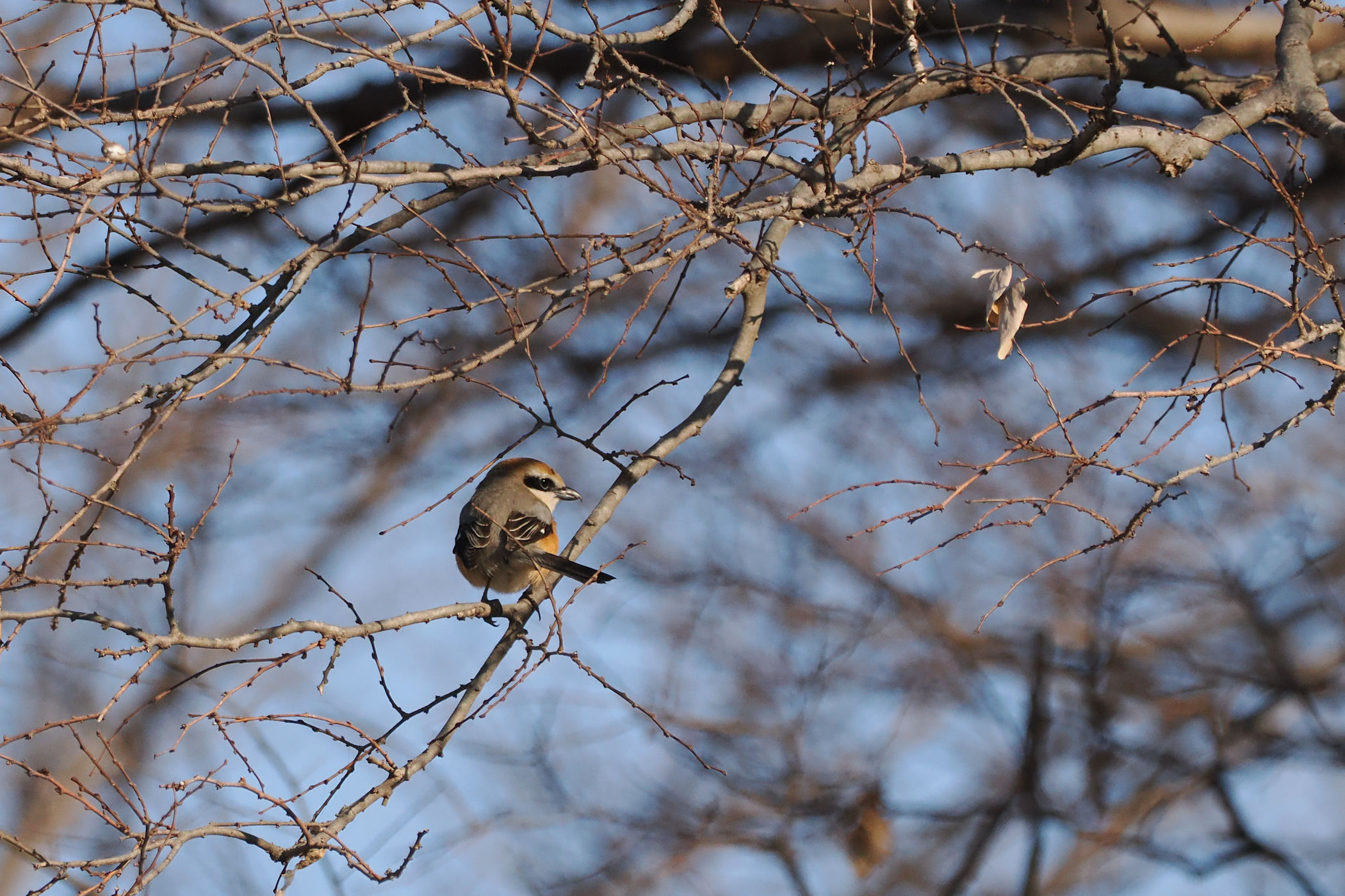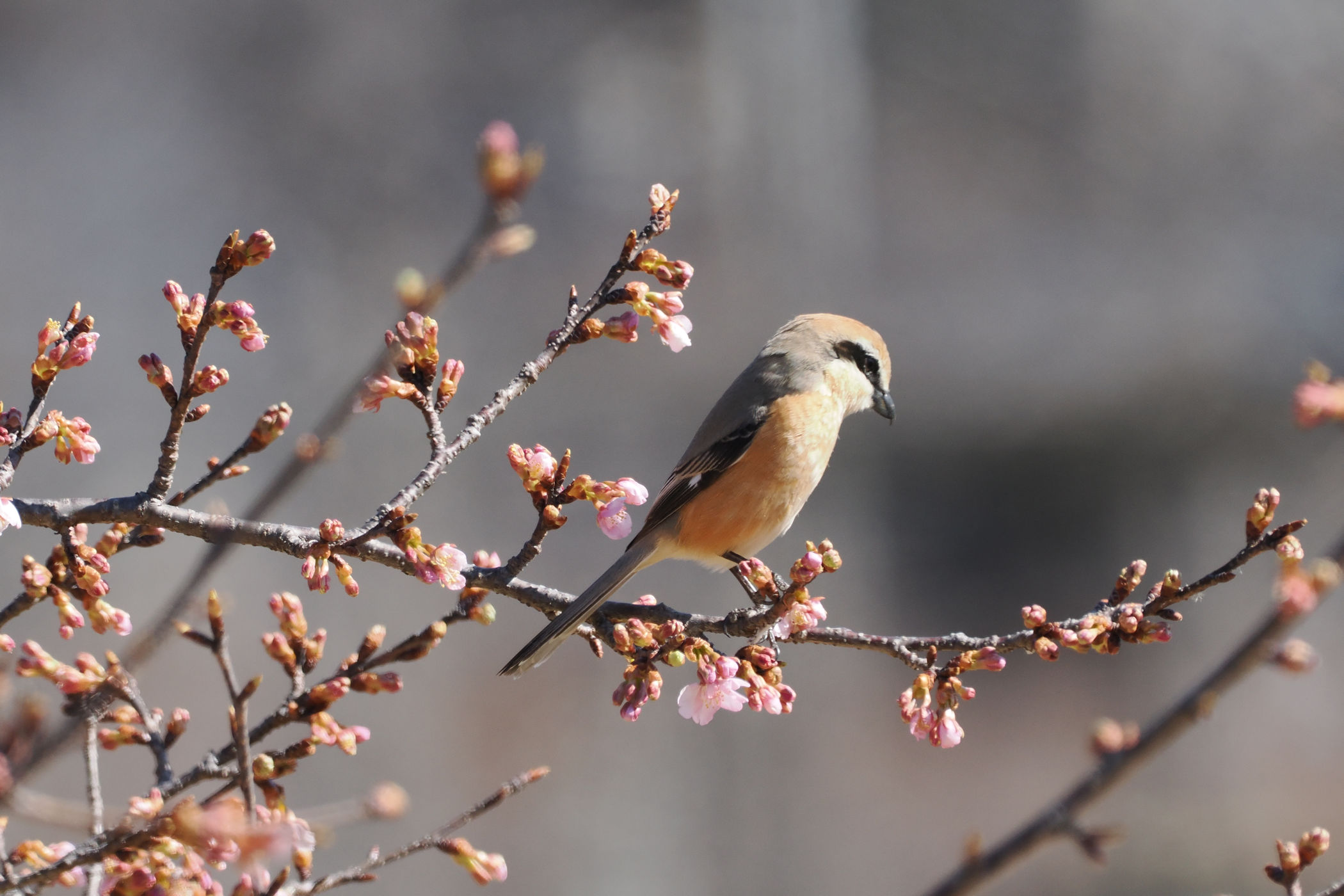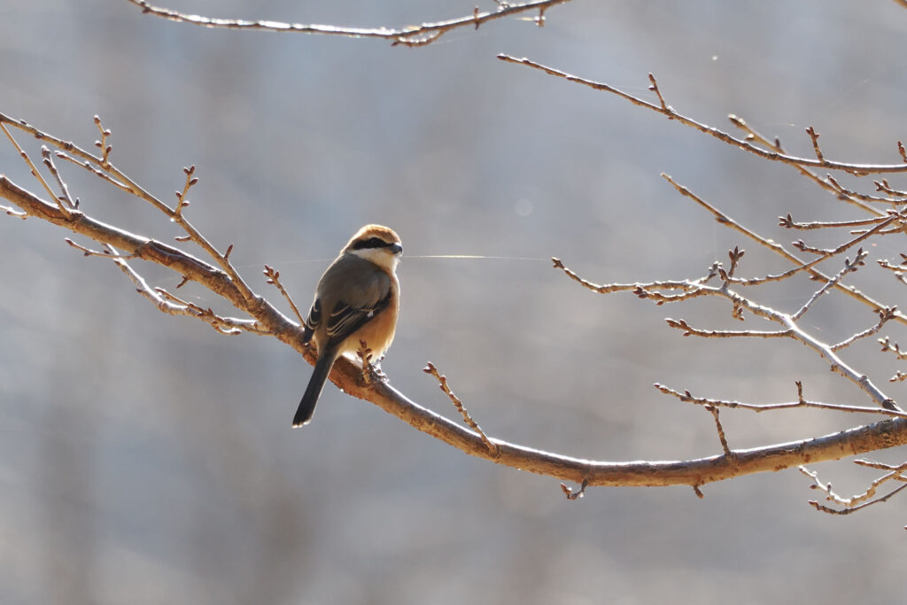 近くのサクラにはモズの旦那も