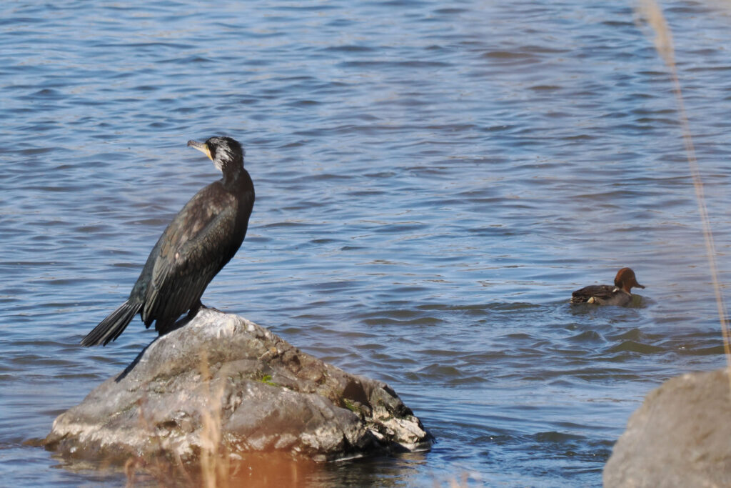 岸辺近くの石の上にはカワウさん