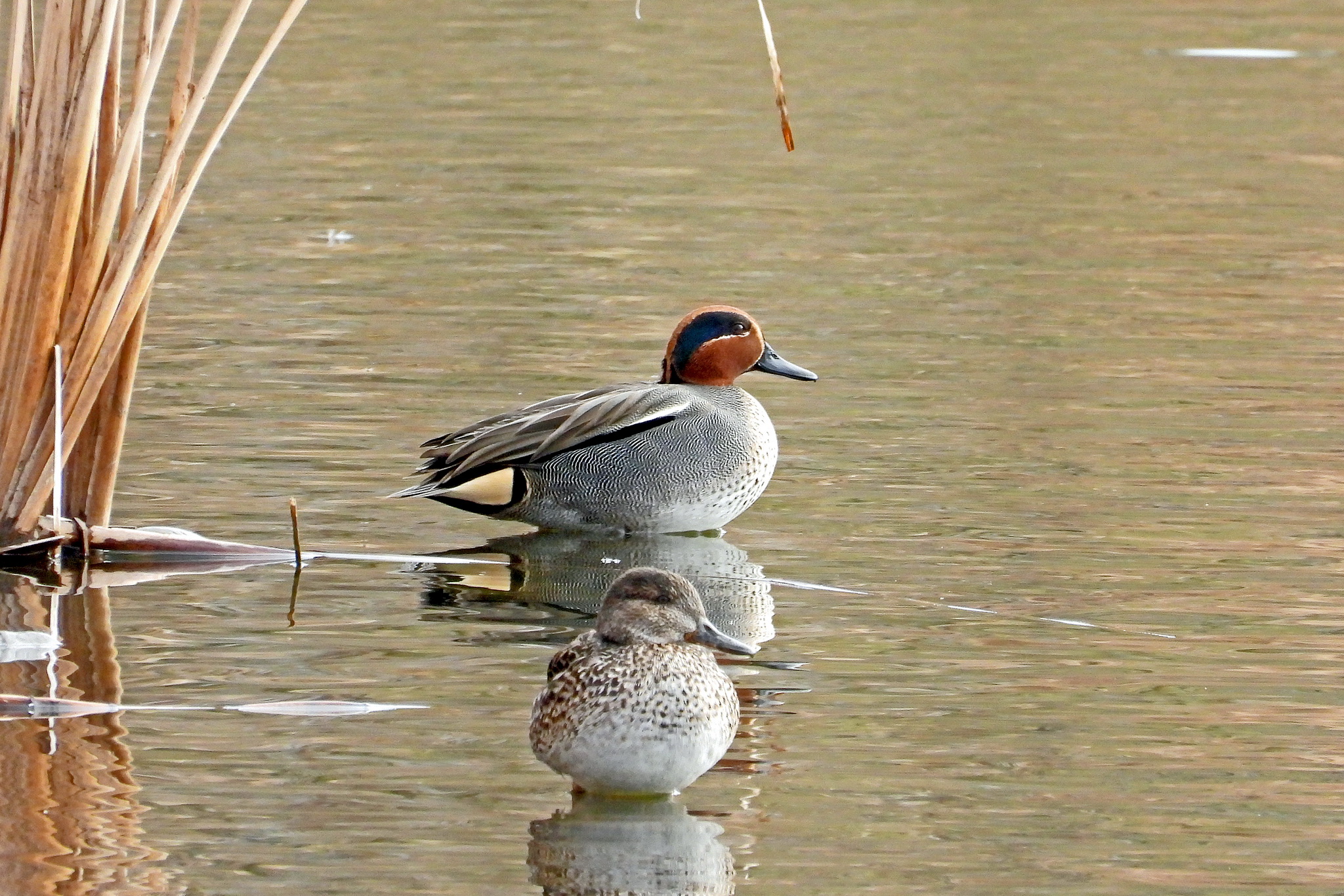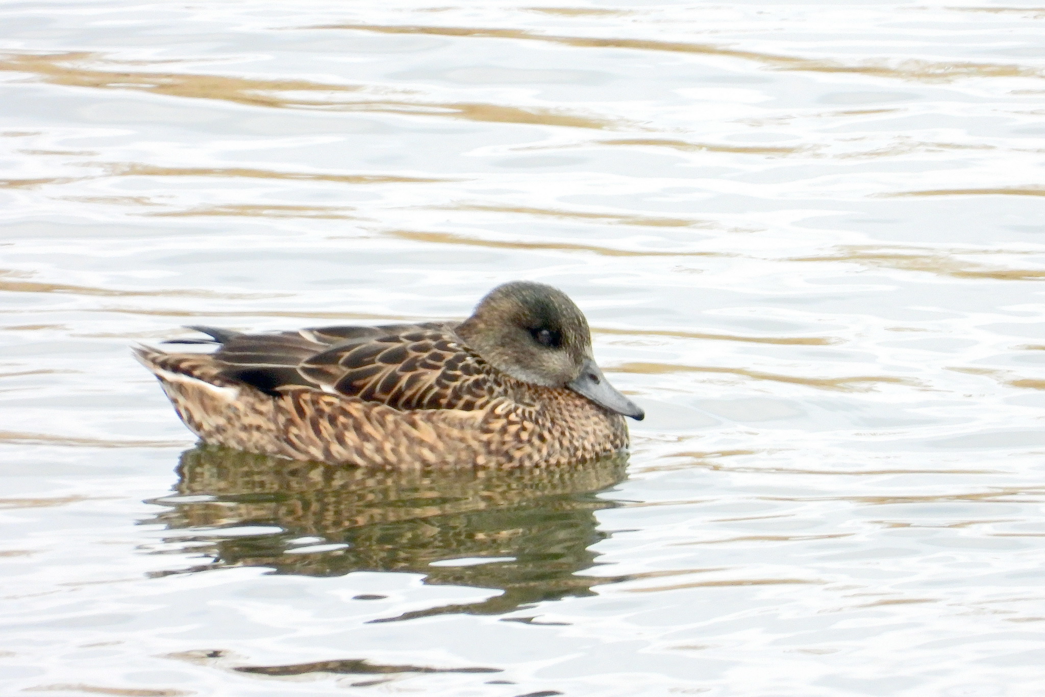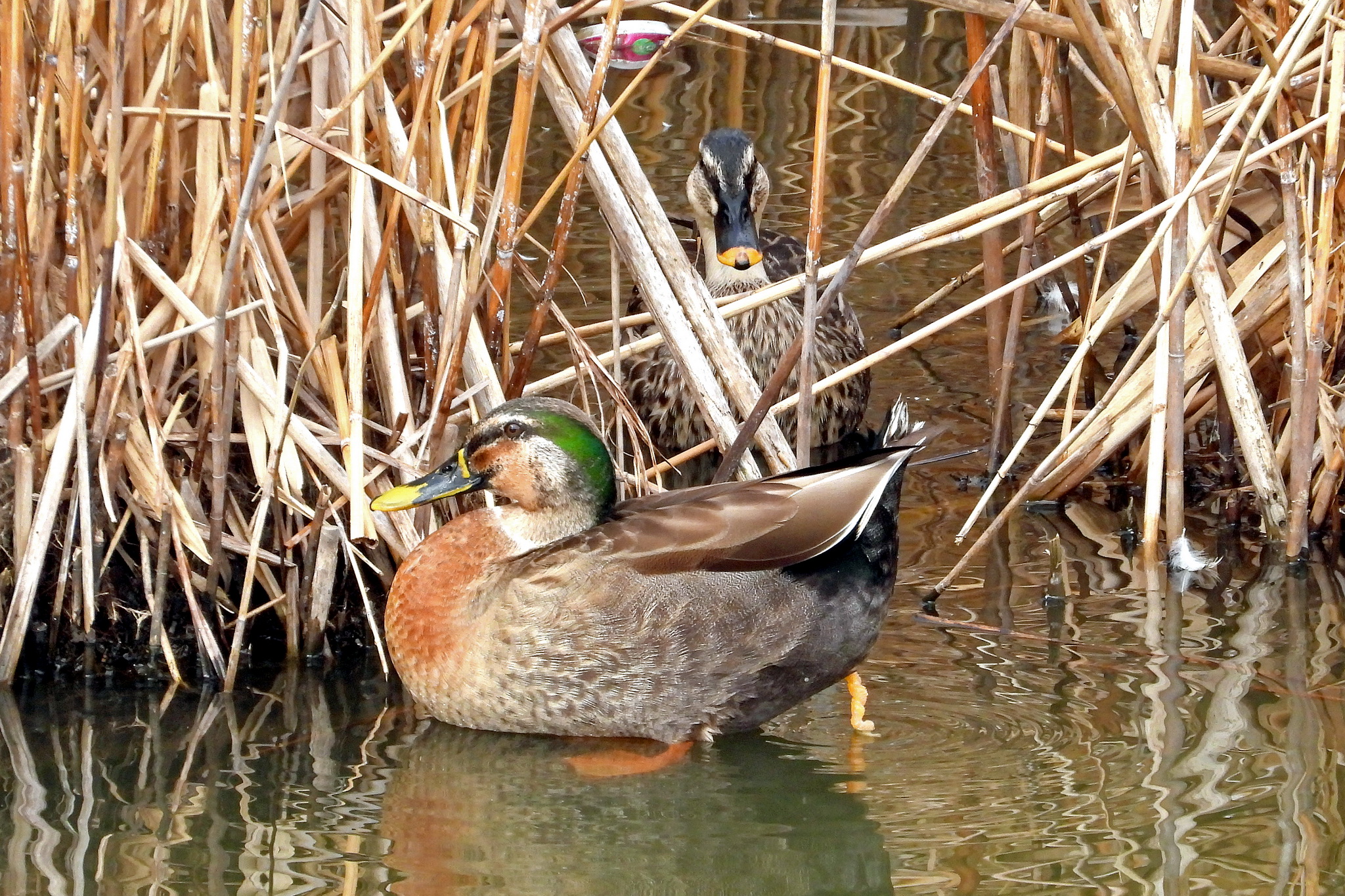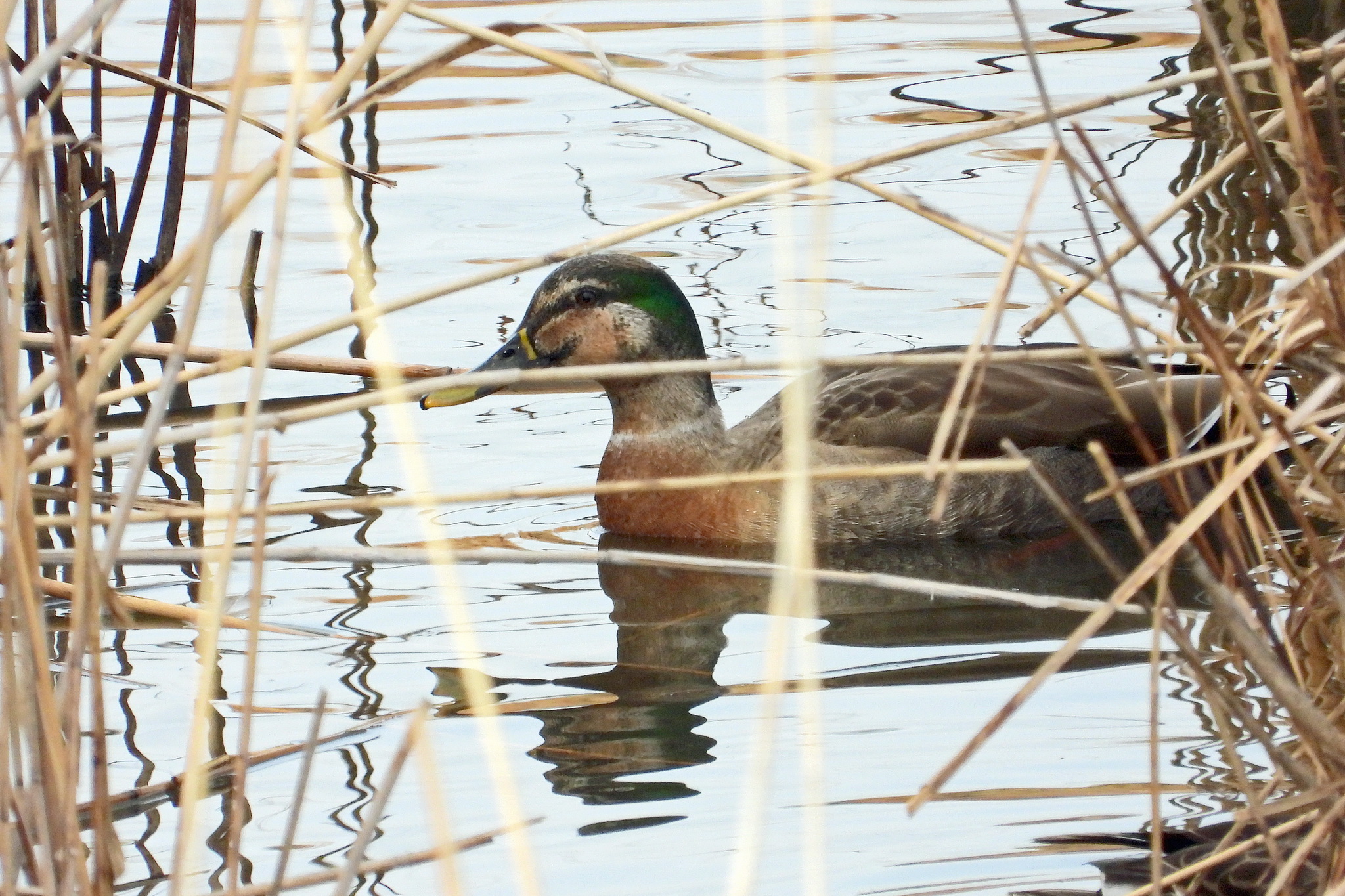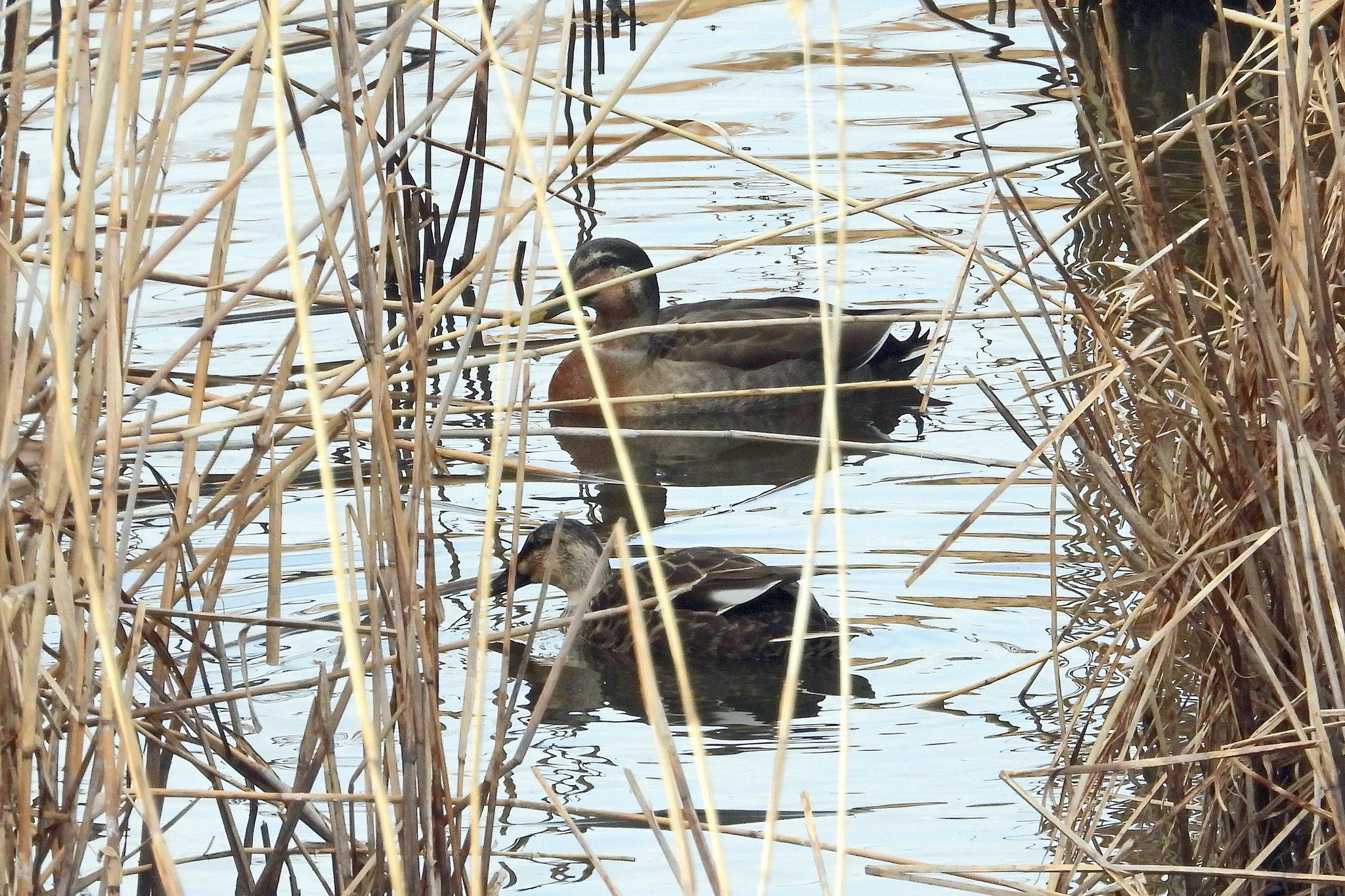 おっ、葦原の向こう側に「マガモ」と「カルガモ」の交雑種らしきのが居ました。