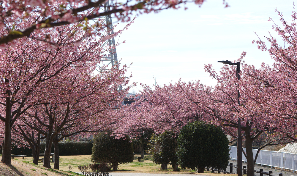 親水公園のカワヅザクラはどの樹も花盛り。