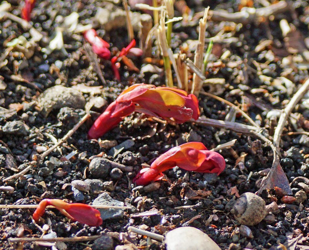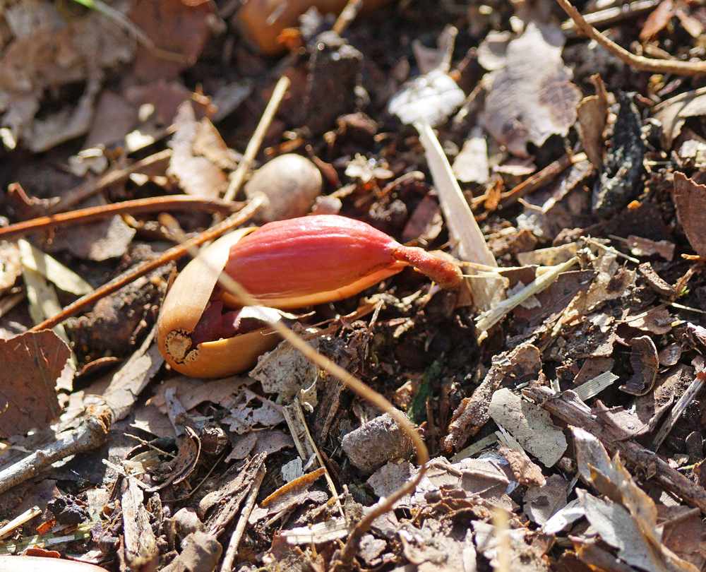 近くでコナラも殻が割れて、子葉が出てきました。やはり赤っぽい、でもちょっとくすんだ色です。