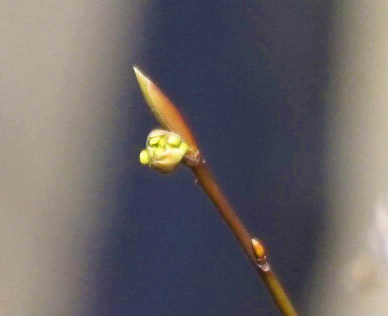 クロモジは蕾がわずかに綻んで、雄蕊の葯が頭を覗かせていました。