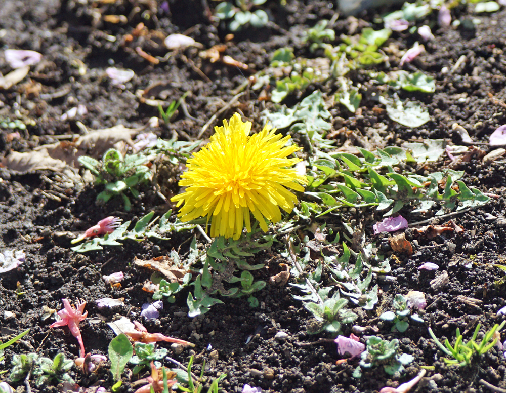 地面に張り付くように咲いているセイヨウタンポポが、陽射しを浴びてキラキラ・・・。