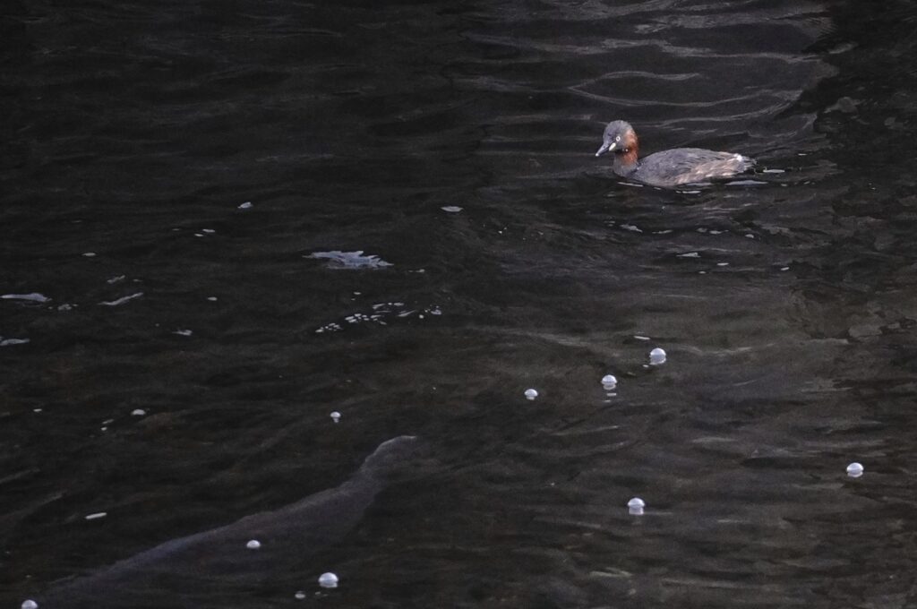 大きな鯉の後ろに カイツブリ