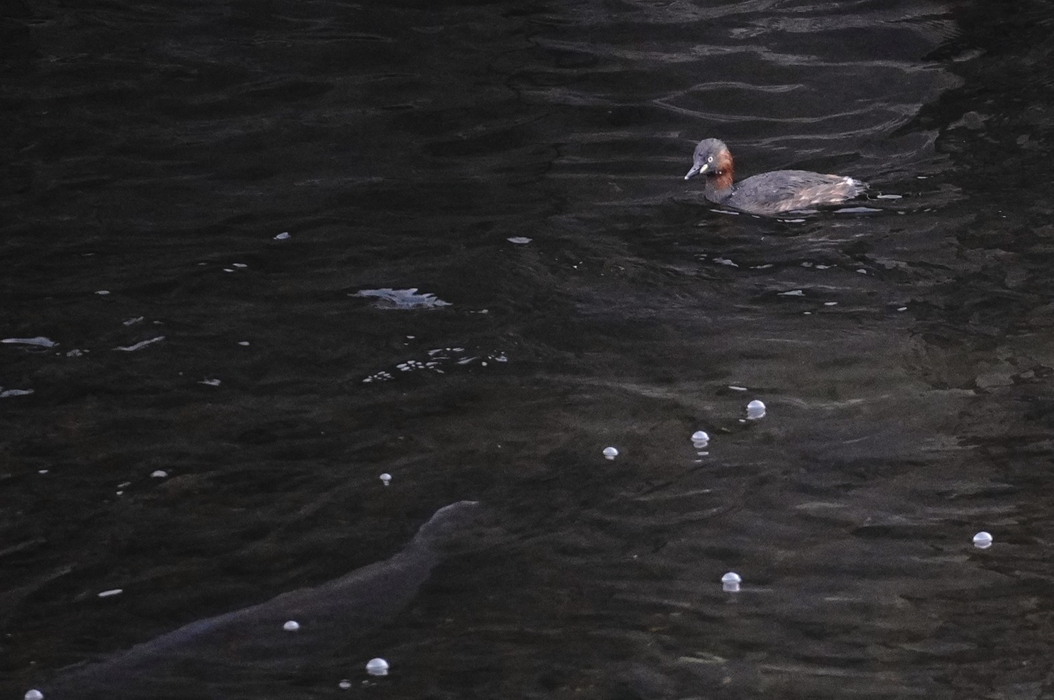 大きな鯉の後ろに カイツブリ