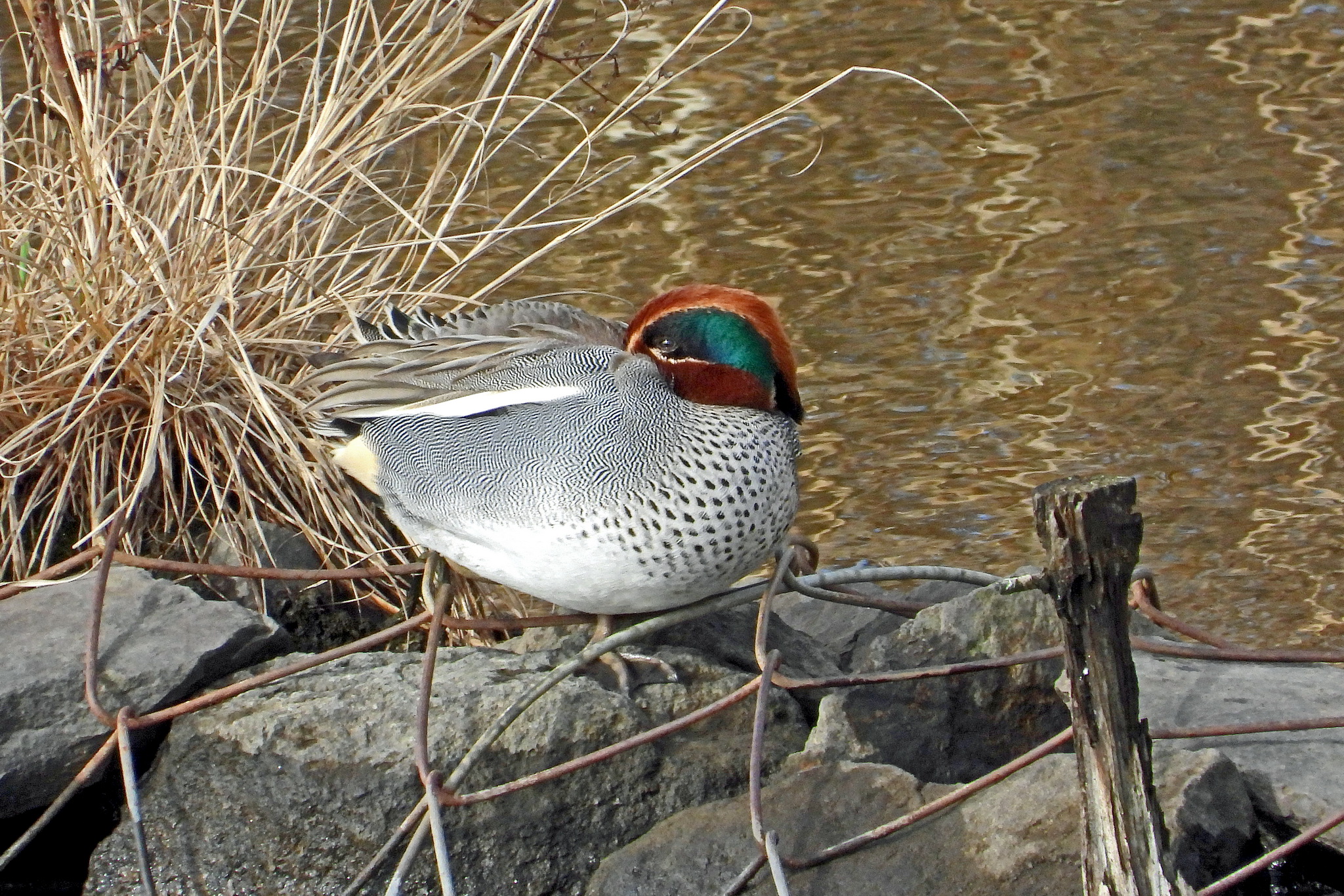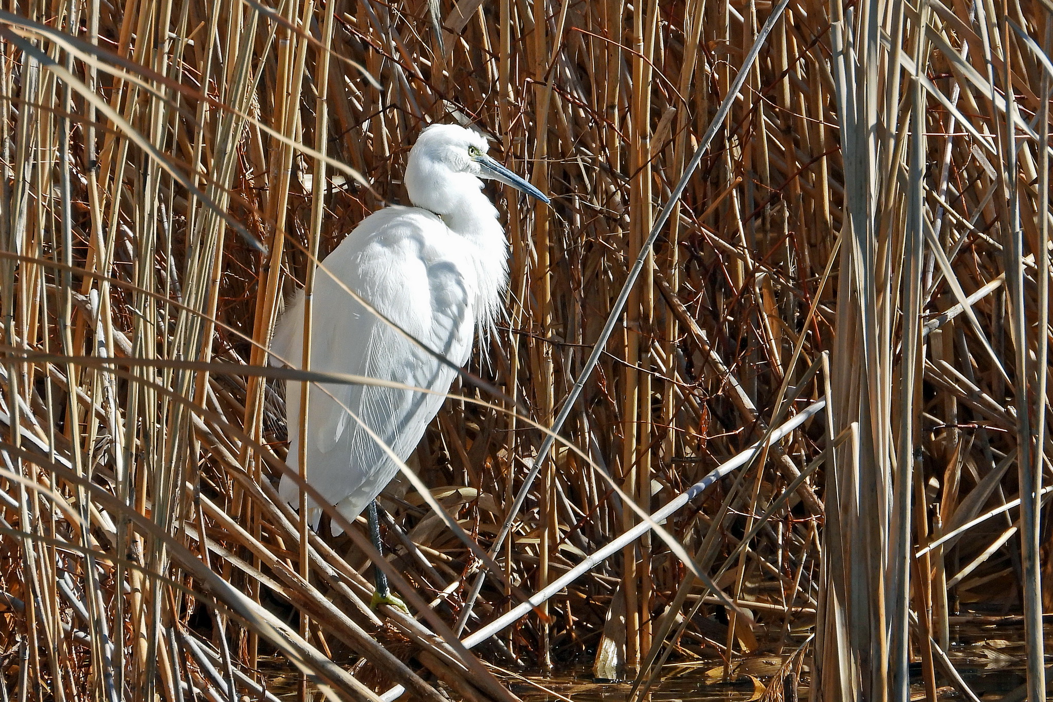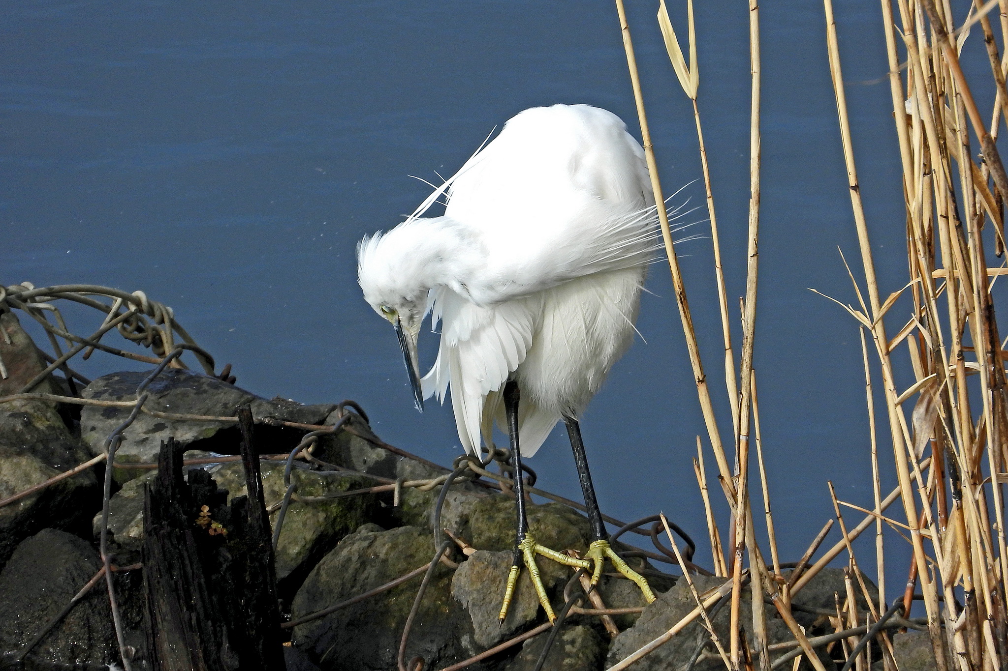「コサギ」がカモ類を押しのけて、葦原脇に移動して羽繕いを始めました。