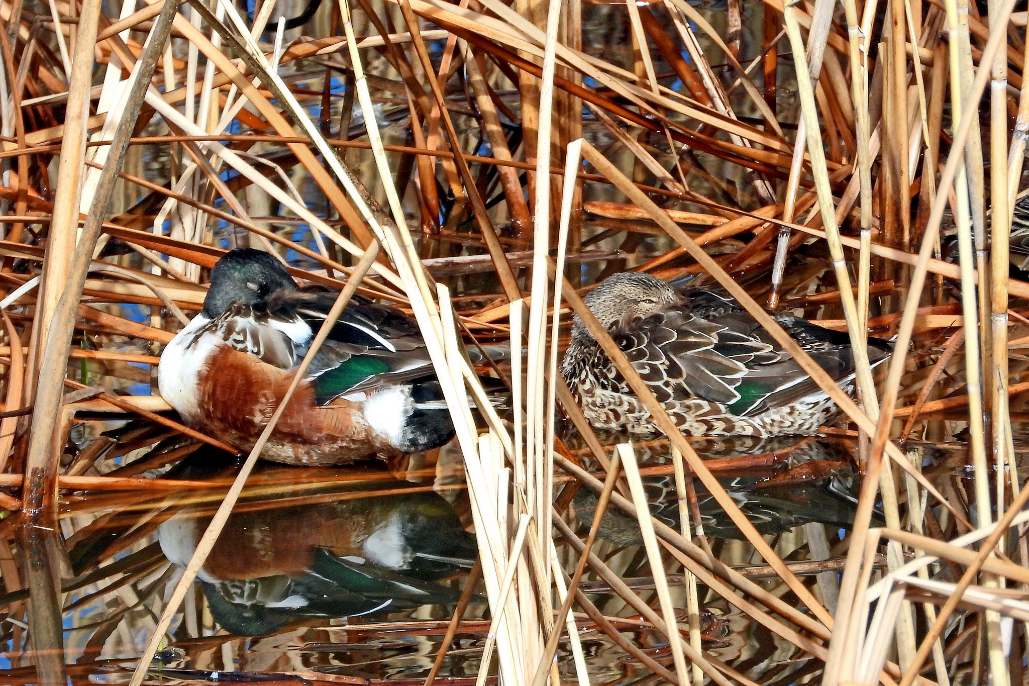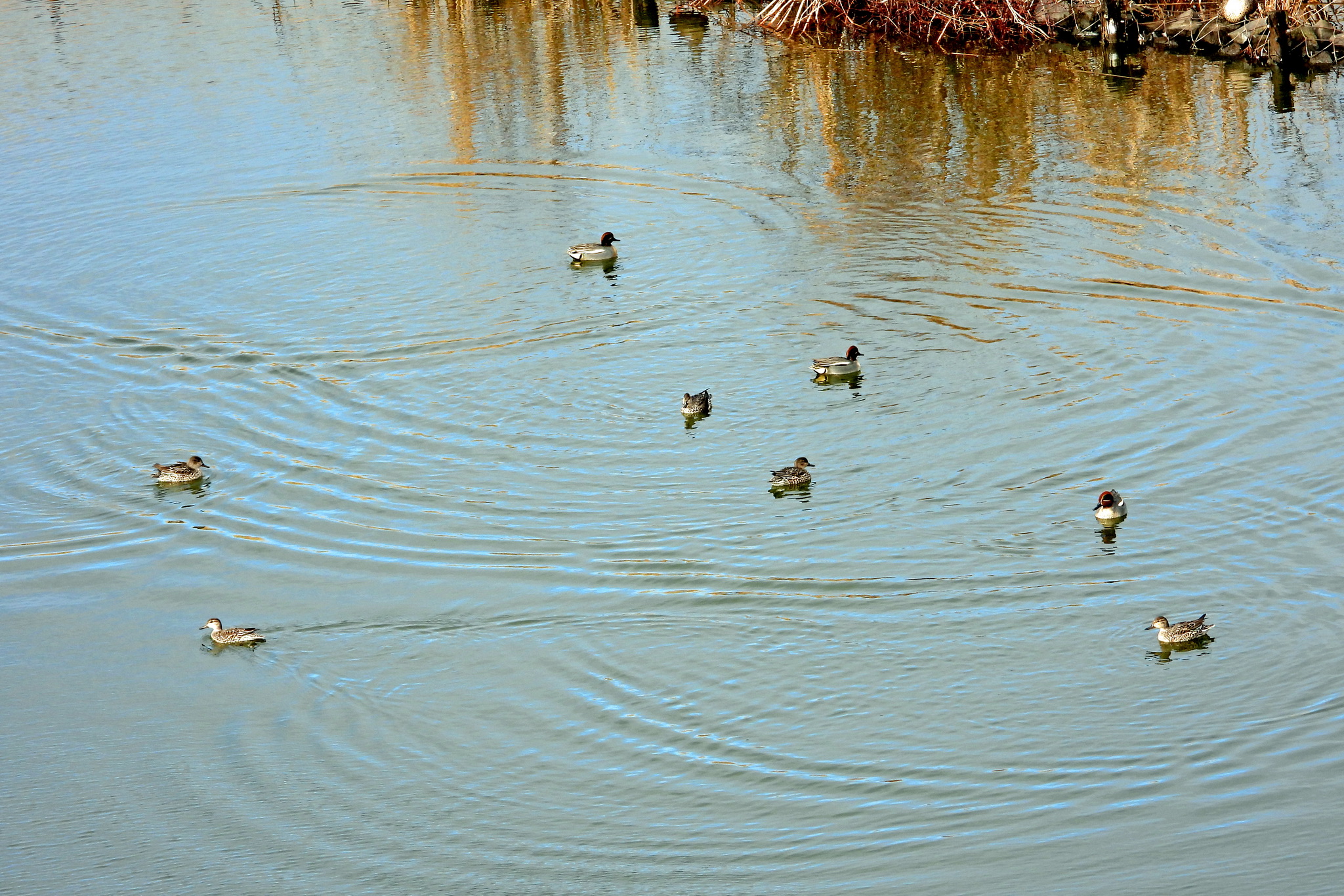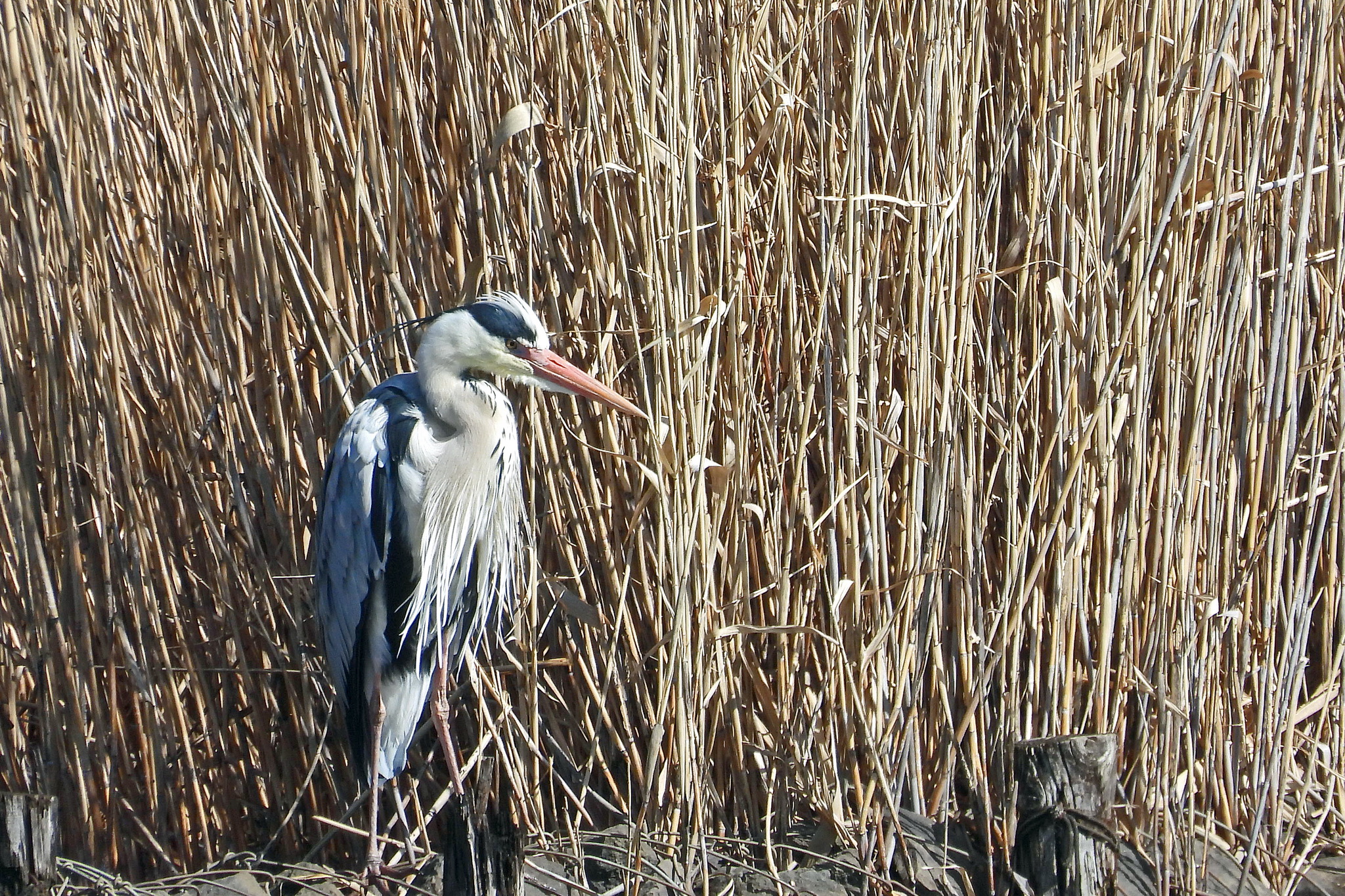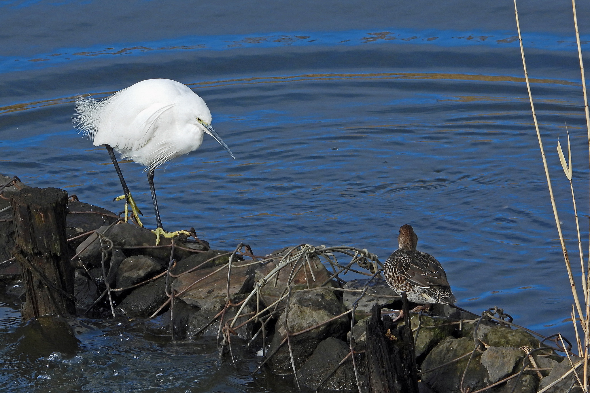 「コサギ」がカモ類を押しのけて、葦原脇に移動して羽繕いを始めました。