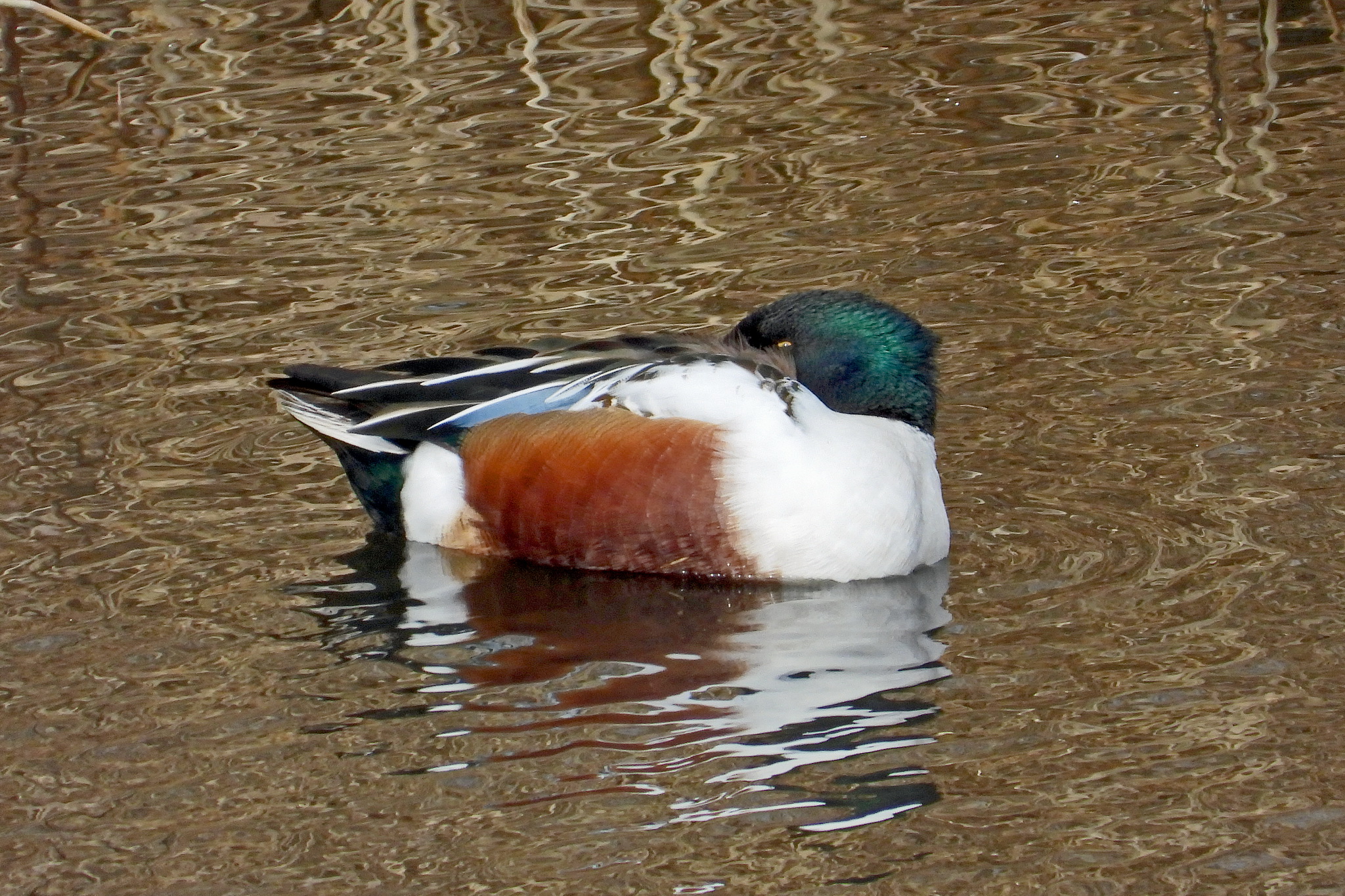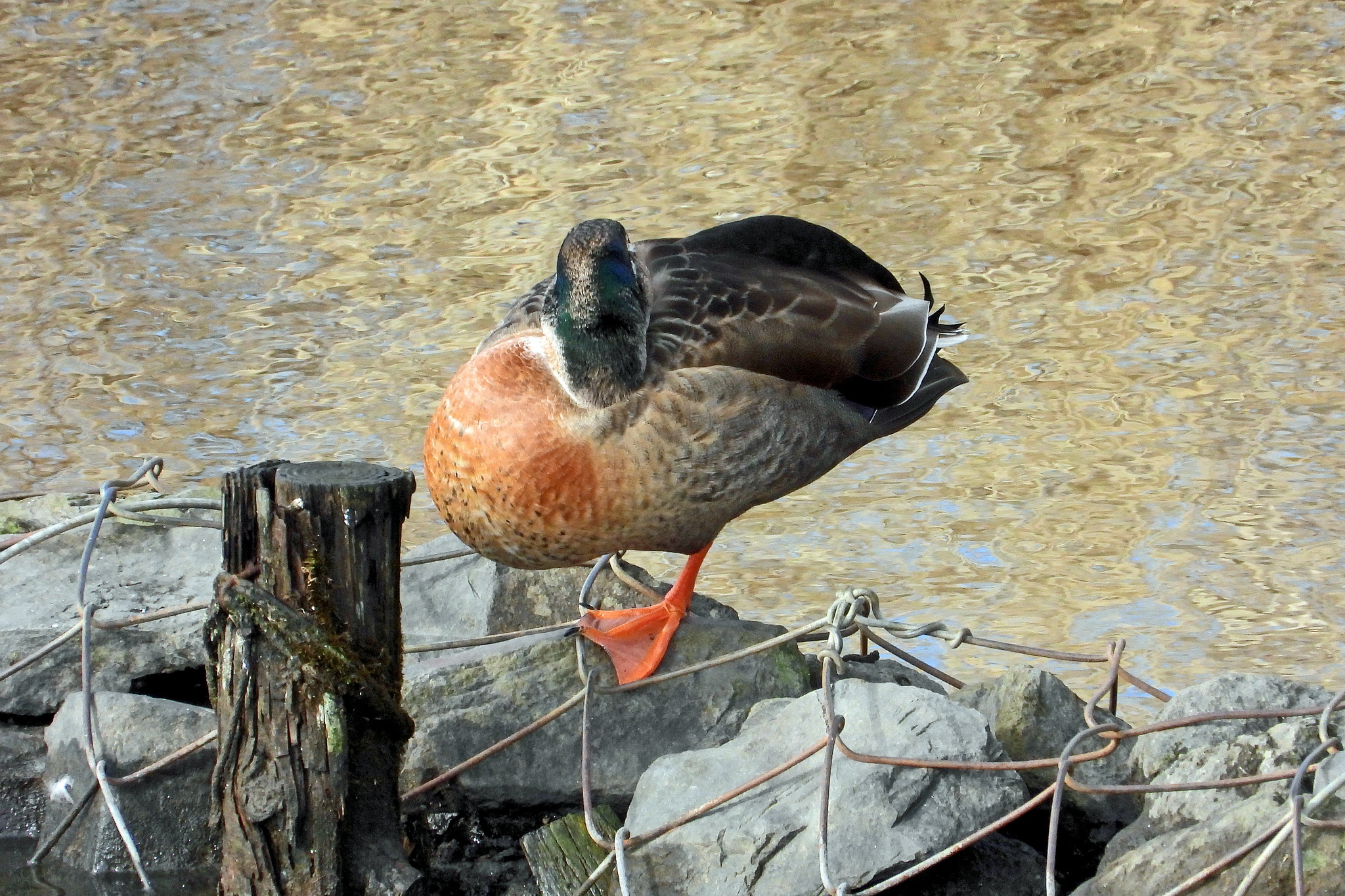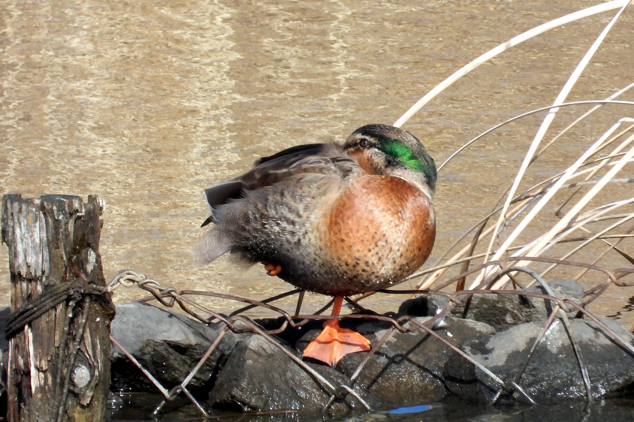 おっ、「マガモ」と「カルガモ」の交雑種がうずくまってますね。