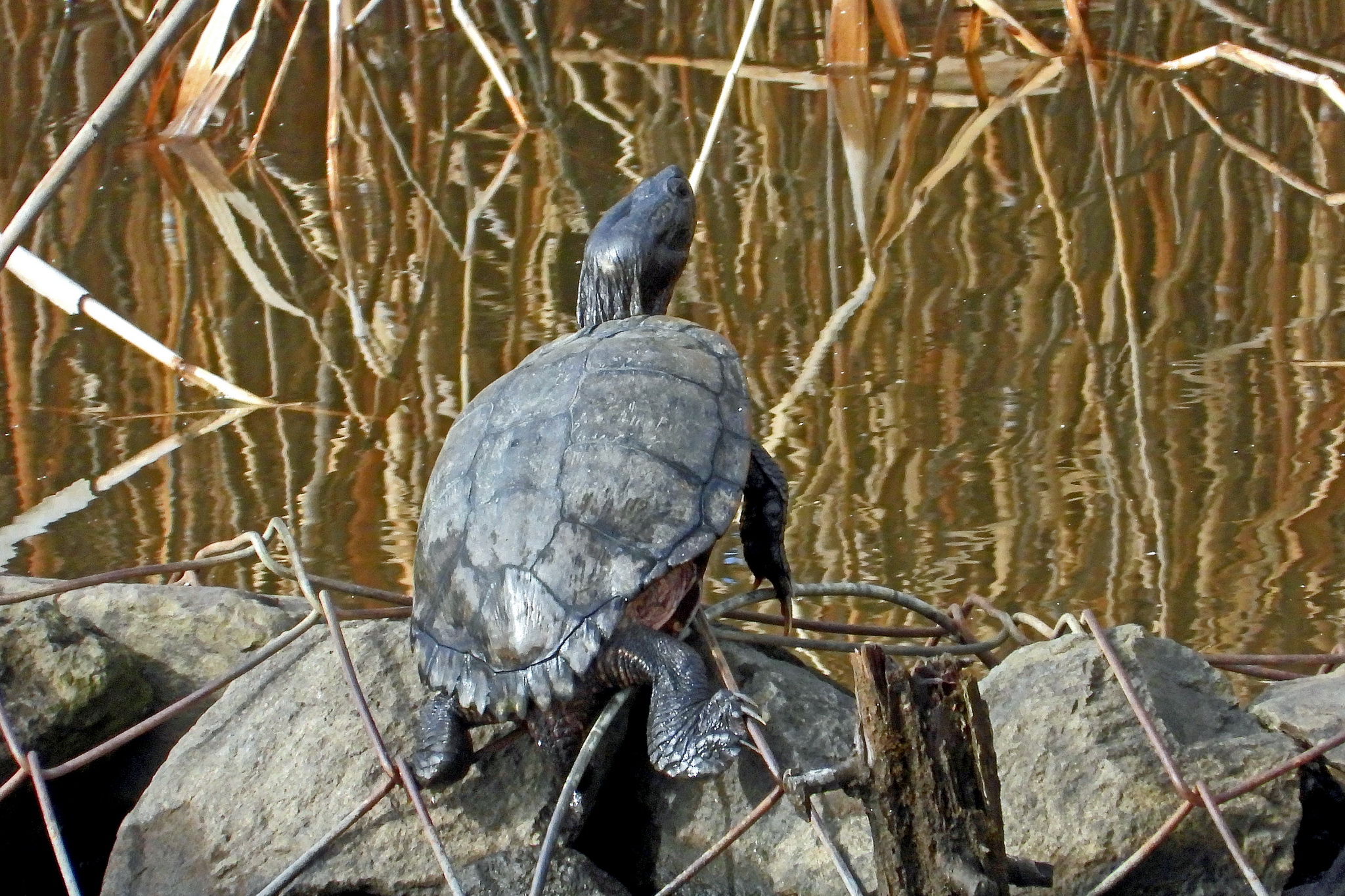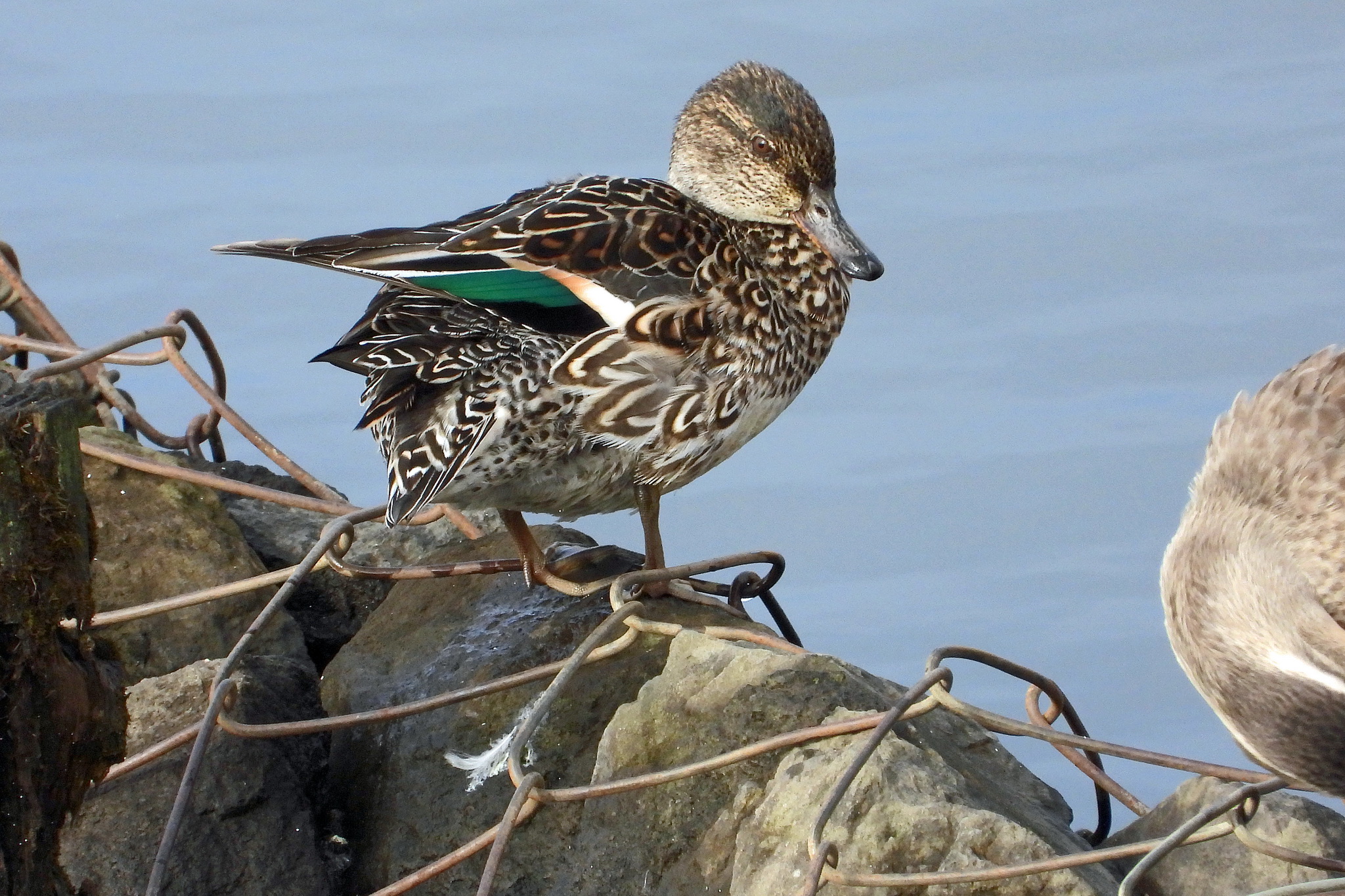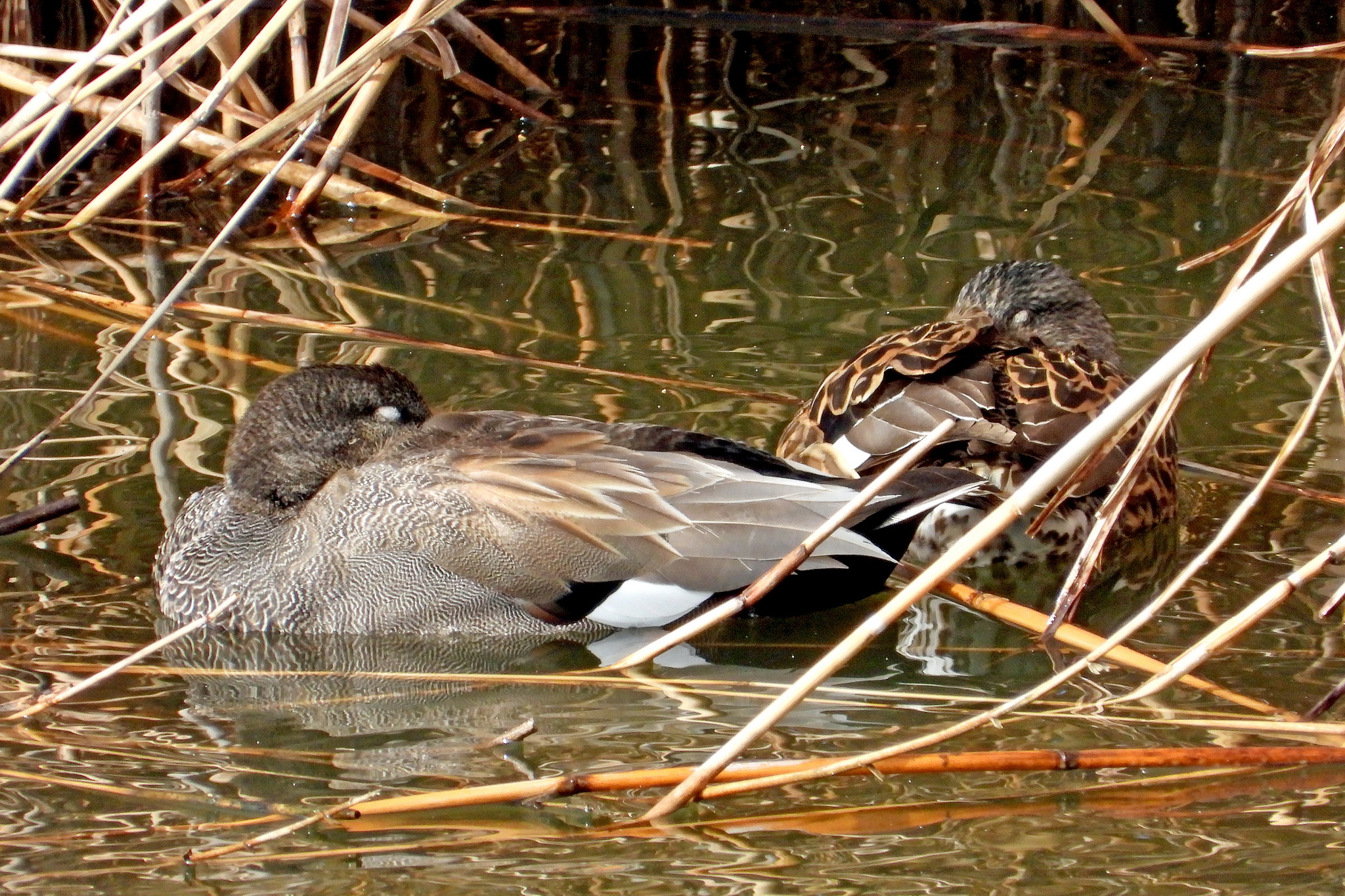 おっ、「マガモ」と「カルガモ」の交雑種がうずくまってますね。