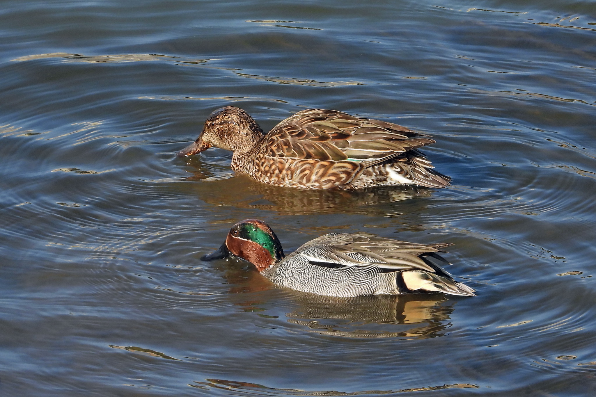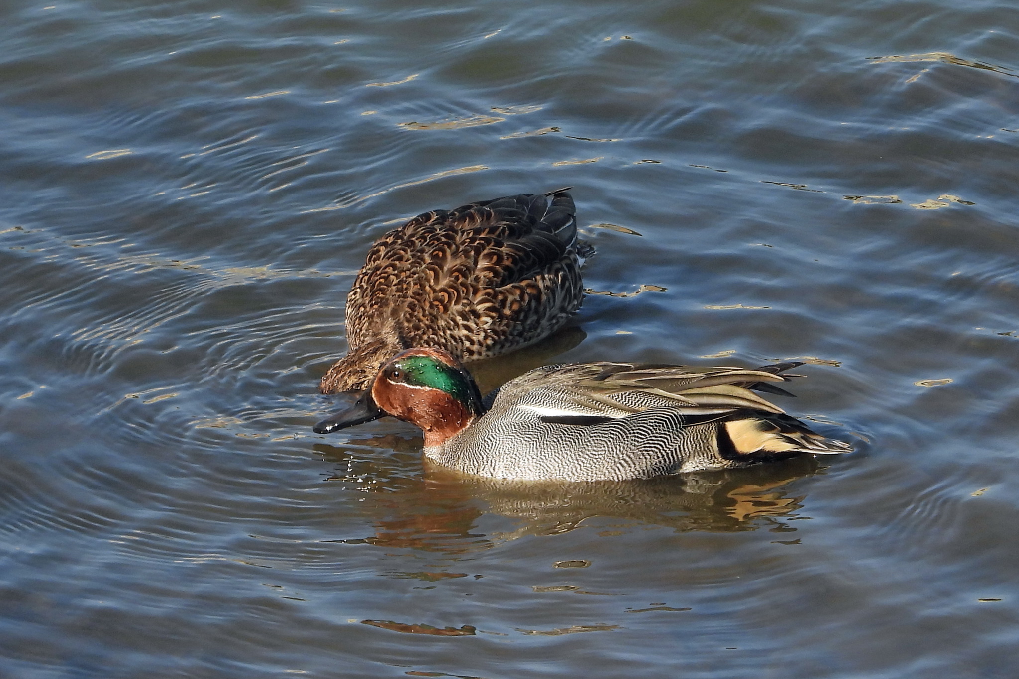 カップルらしき「コガモ」が、ブレックファースト中です。