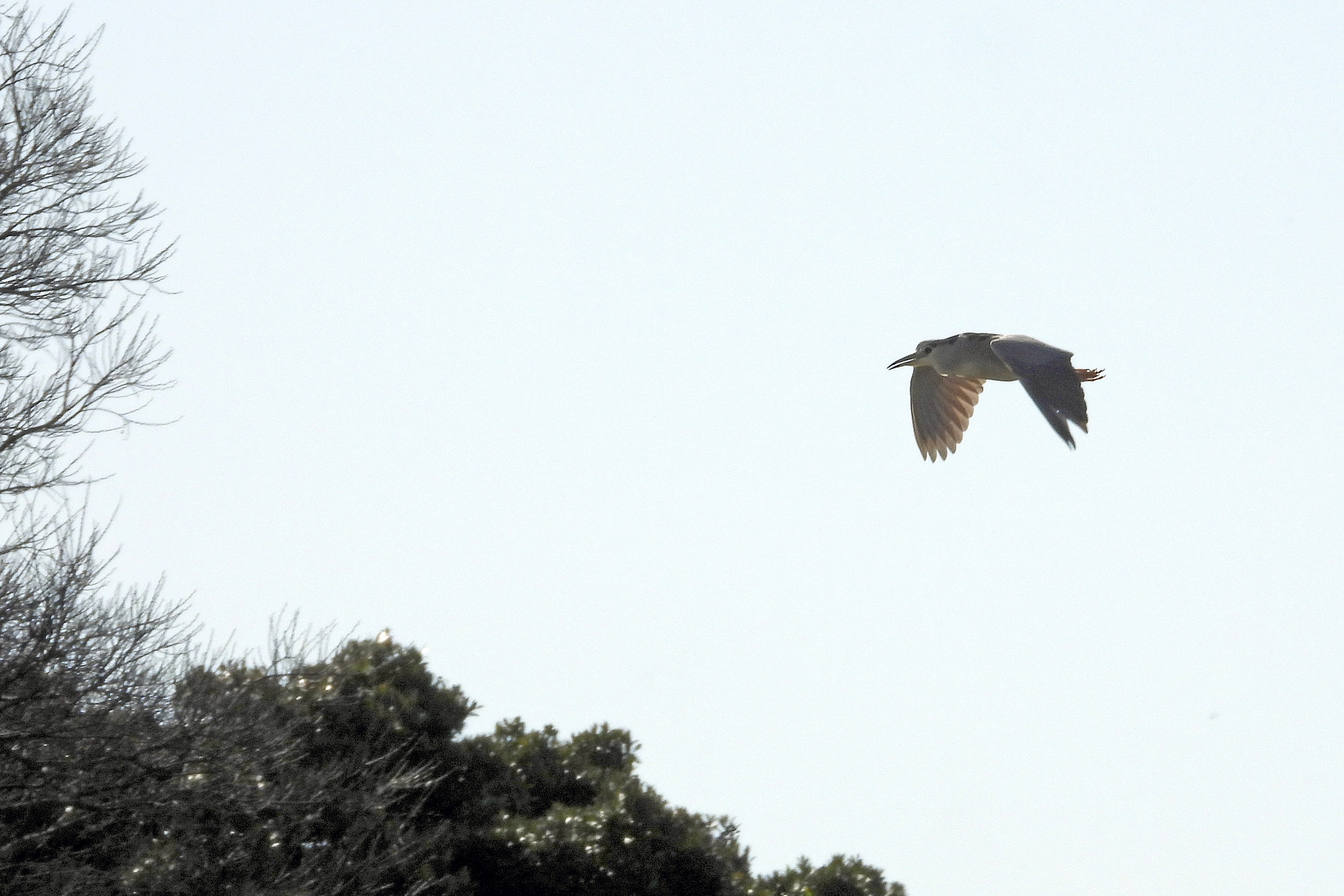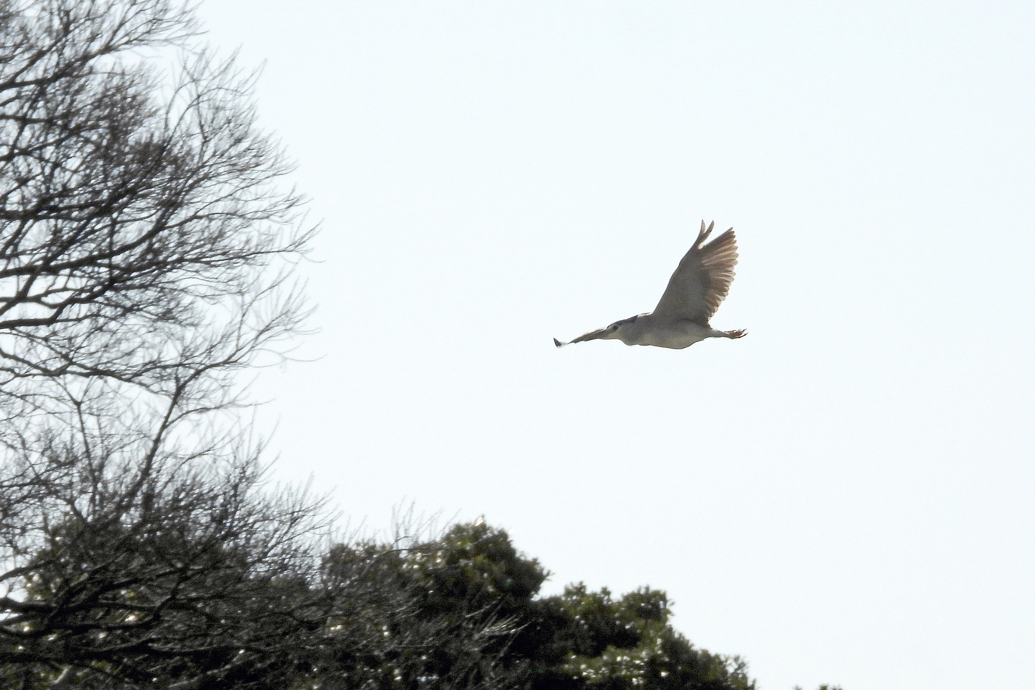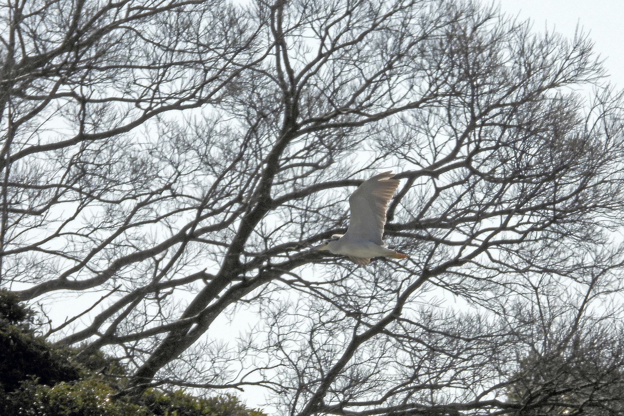 最初の写真の、飛んでる「ゴイサギ」をトリミングして拡大しました。
