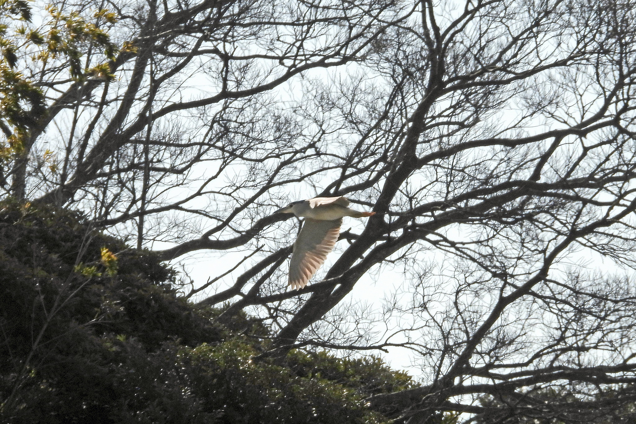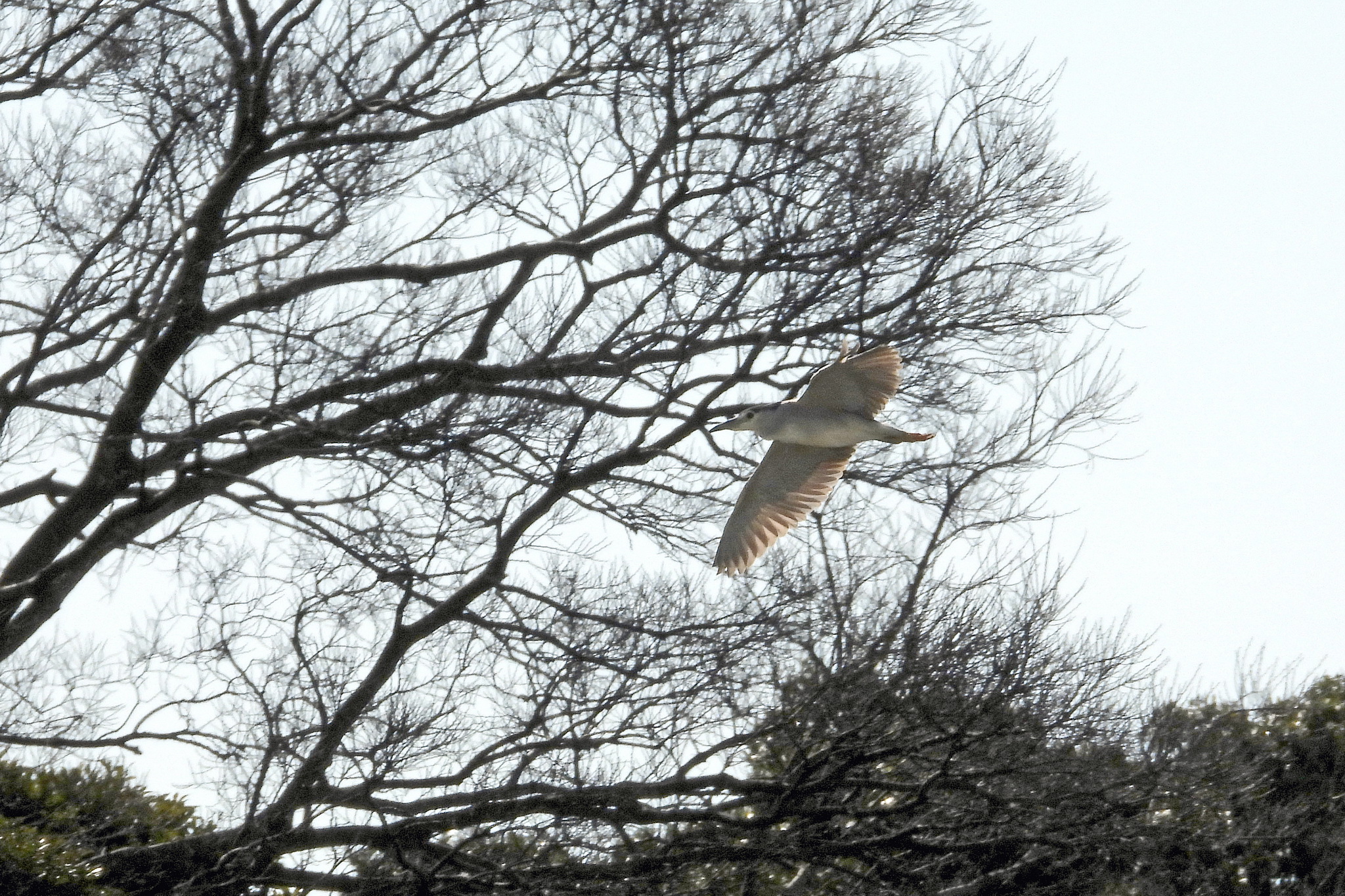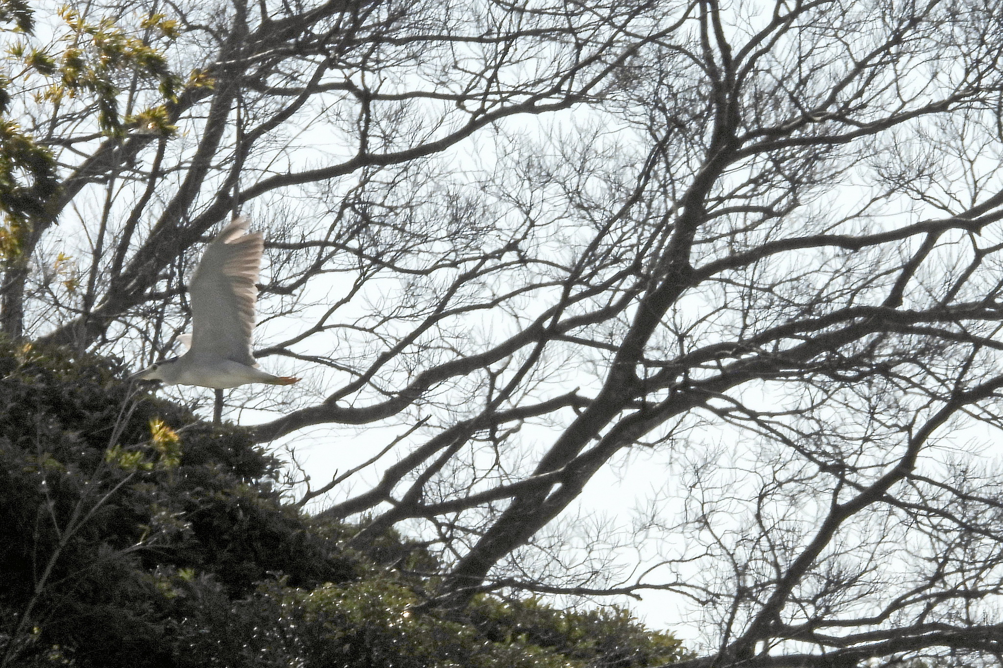 最初の写真の、飛んでる「ゴイサギ」をトリミングして拡大しました。