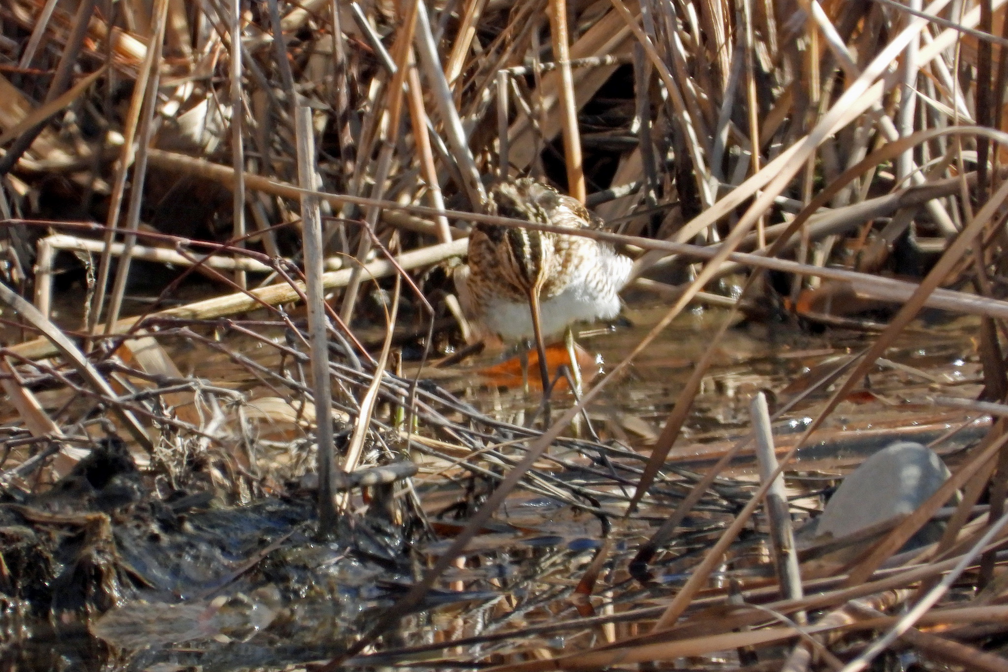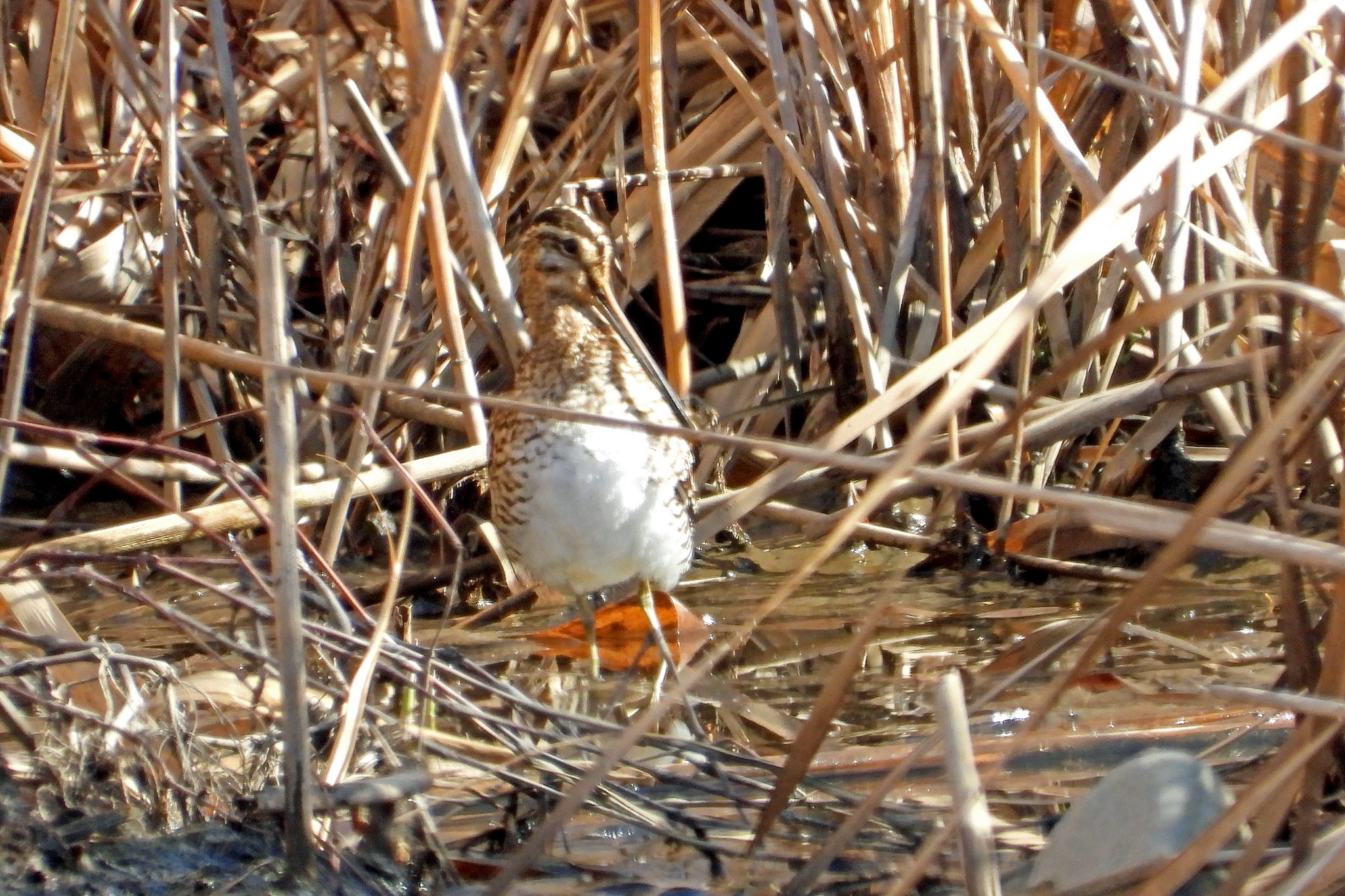 望遠を利かして葦原を探っていたら、「タシギ」が居ました。