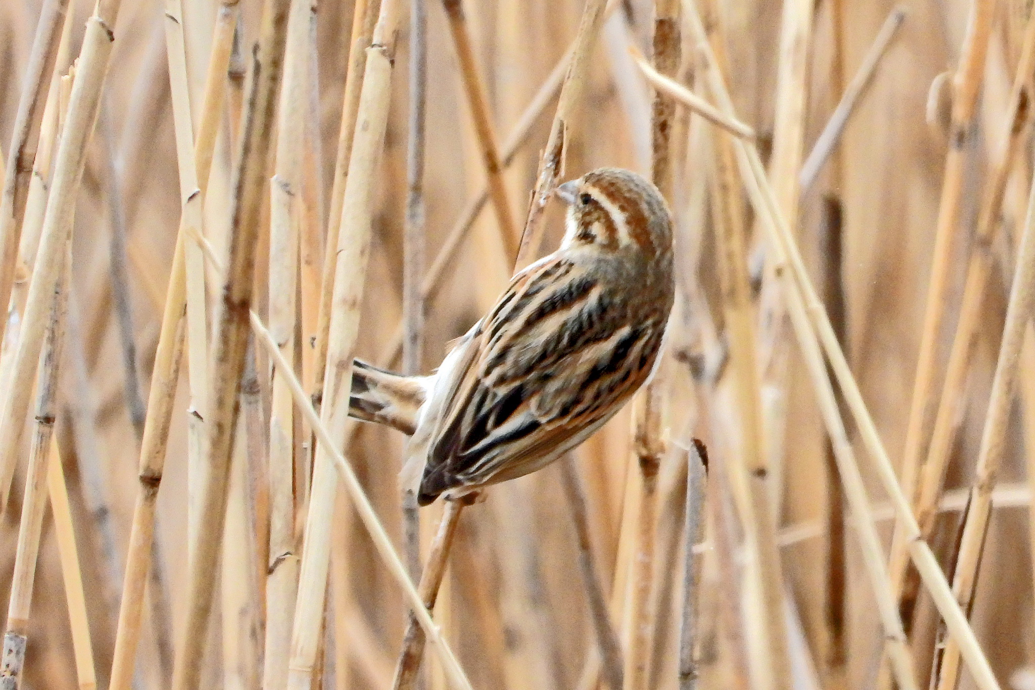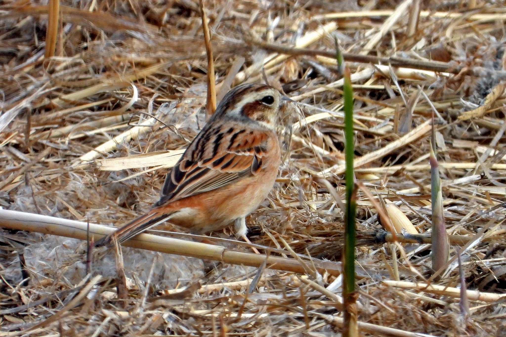 刈られた葦原で「ホオジロ」のメスがお食事中です。