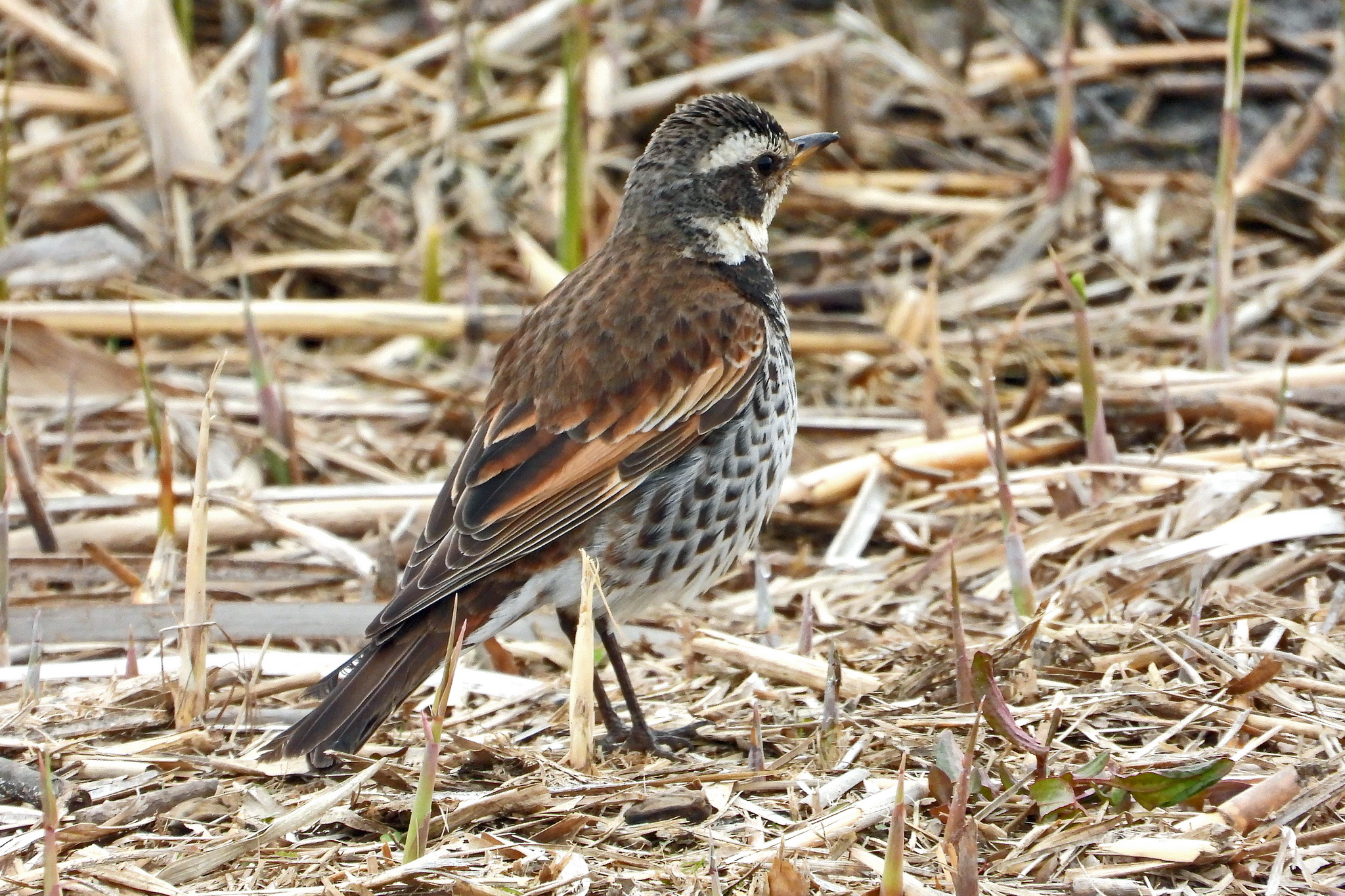 葦原の刈られたところに「ツグミ」が居ました。