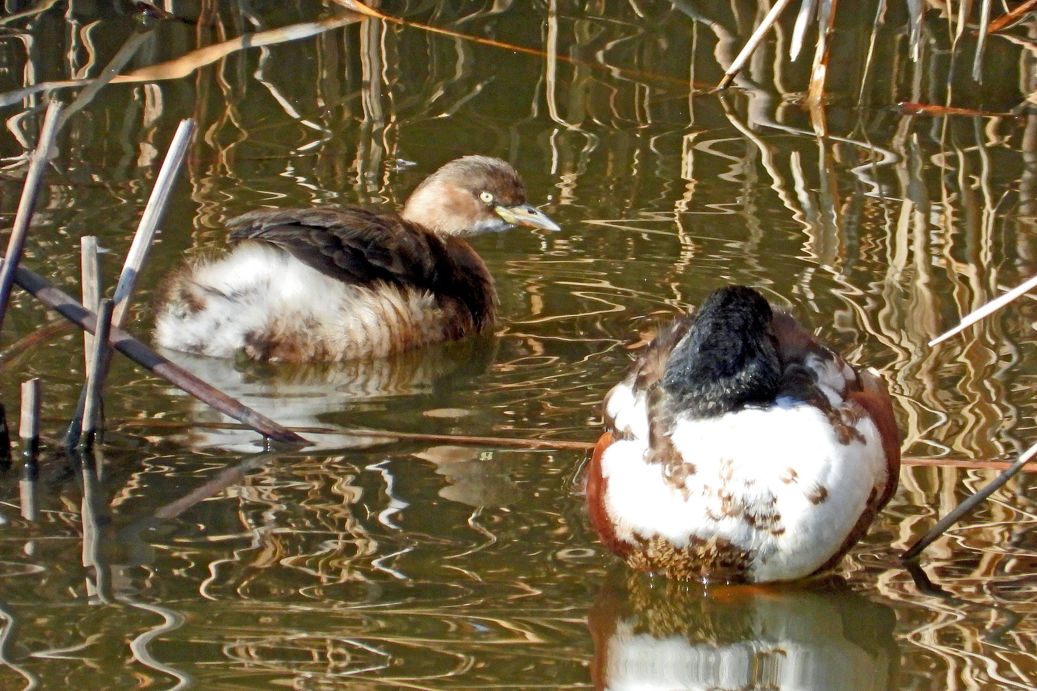 「ハシビロガモ」と「カイツブリ」のツーショットです。