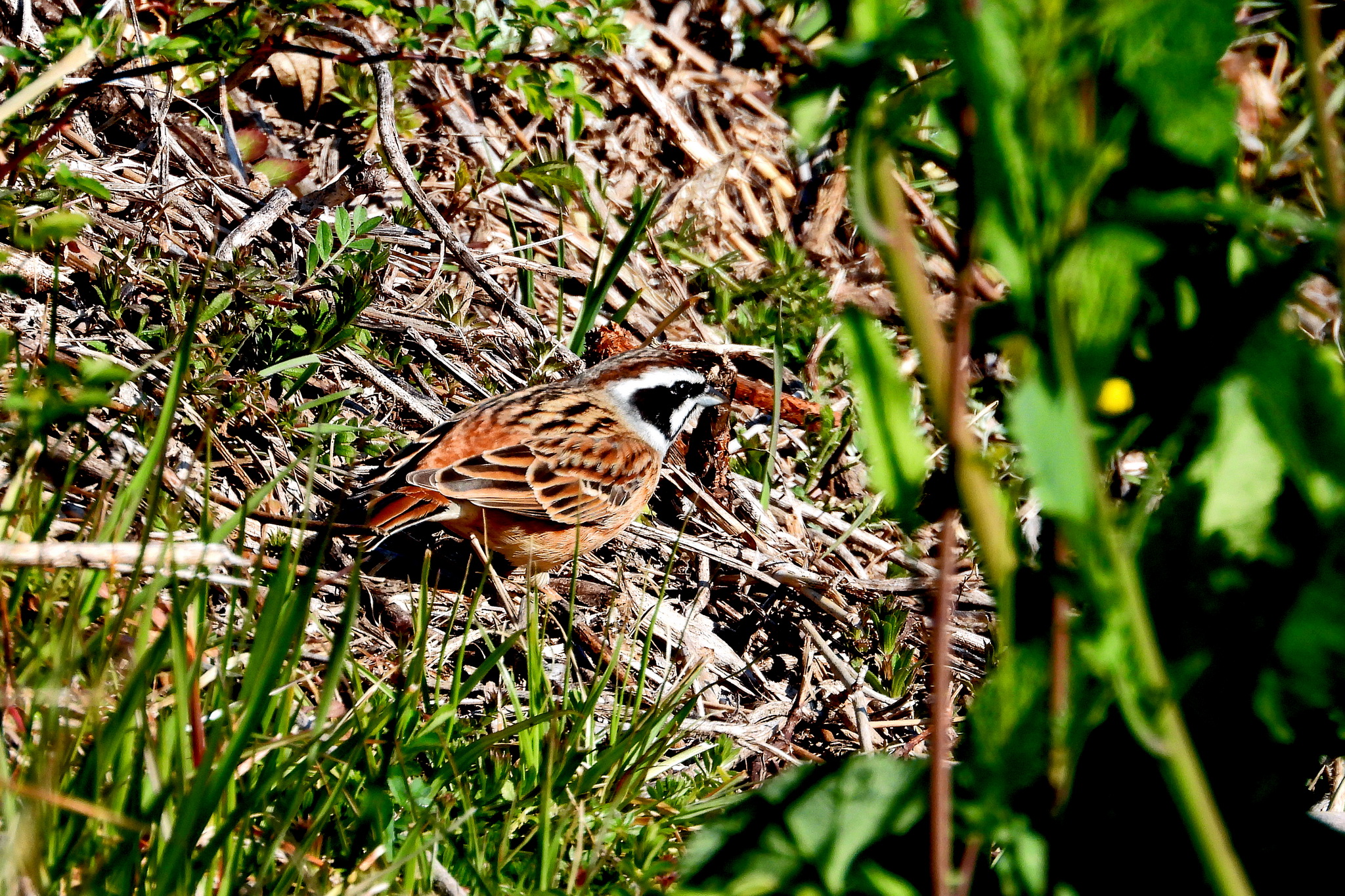 草むらで「ホオジロ」が食事をしていました。